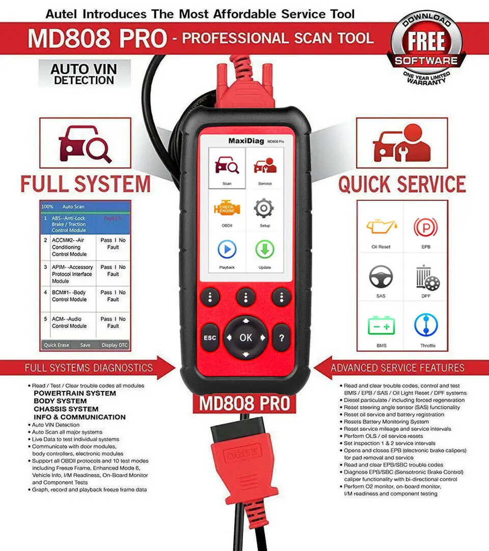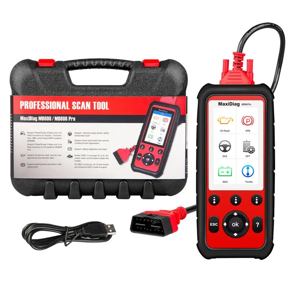 MaxiDiag MD808 ProСоздан, чтобы перевести ваш диагностический опыт на совершенно новый уровень. Загружен сбросом обслуживания масла, регистрация и сброс батареи, парковочная тормозная колодка повторно учатся после замены, датчик угла поворота рулевого управления и дизельные функции регенерации фильтра твердых частиц, MD808 Pro может получить доступ ко всем доступным модулям для лучших операций по диагностике. Со всем, что заключенная в 4-дюймовый ручной прибор, нет лучшего Многофункциональный сканирующее устройство на рынке.
