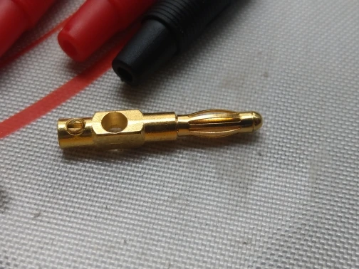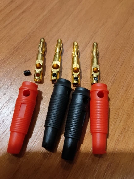 Крайне сомнительно, что это медь с золотым покрытием. Винт чёрный. Гнездо для провода короткое и широкое. Банан вращается относительно основания, т.е. металлическая часть этого коннектора состоит из двух предметов. Короче, использовать эти коннекторы просто стрёмно.