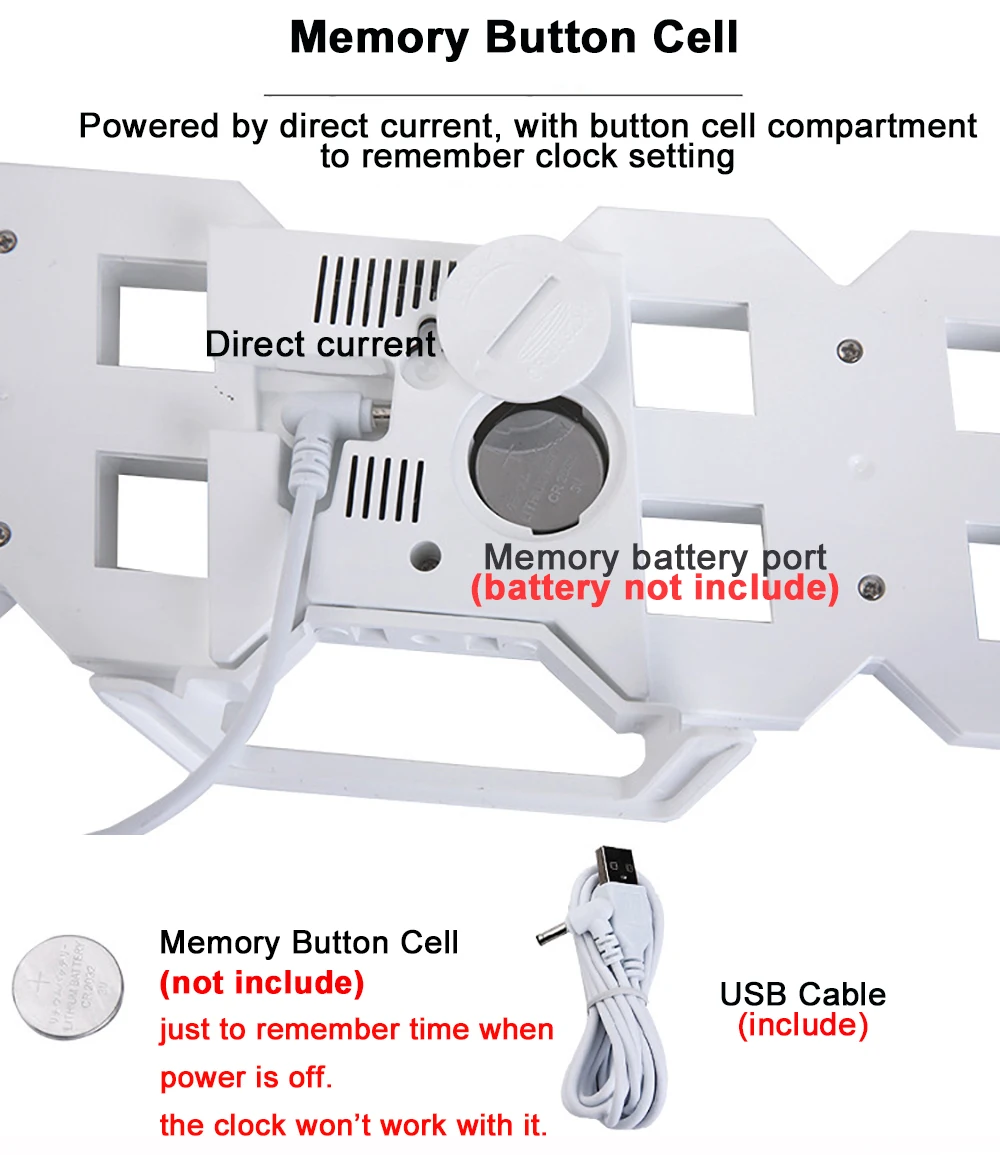 -Кнопка сотового только для записи набора часов(Не включает, нужно покупать отдельно).-При подключении к адаптеру постоянного тока или usb-кабелю часы будут отображать время.-Когда тревога, это остановит сигнал тревоги, если Подключите адаптер постоянного тока или кабель USB.