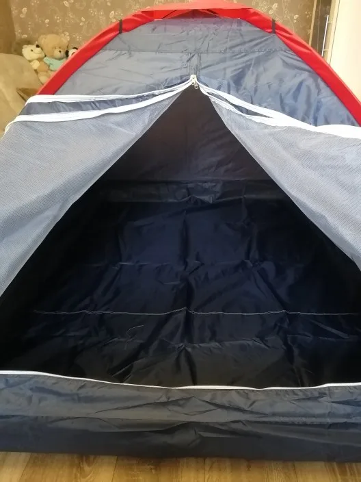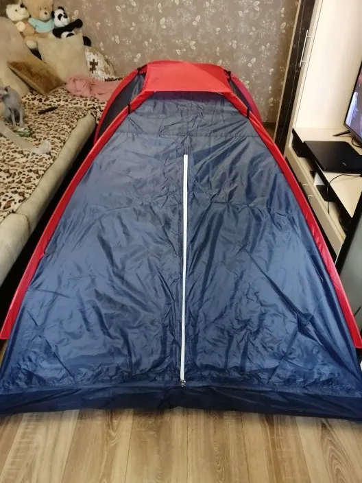 Отличная палатка за эти деньги (1320р.) Тонковата конечно, но для лета не критично, лёгкая, компактная в переноске, места для матраца и двоих человек хватает