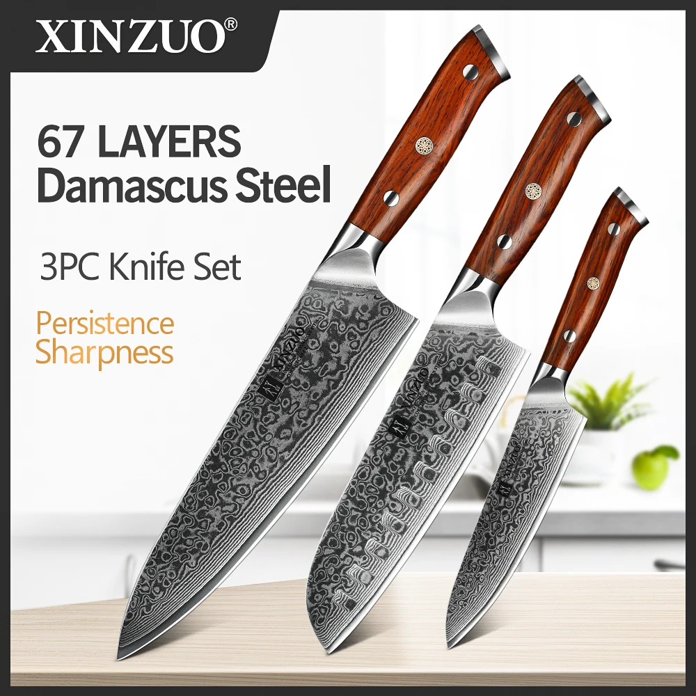 Набор кухонных ножей XINZUO из дамасской стали, профессиональные универсальные шеф-ножи сантоку с ручкой из розового дерева, столовые приборы из нержавеющей стали, 3 шт.