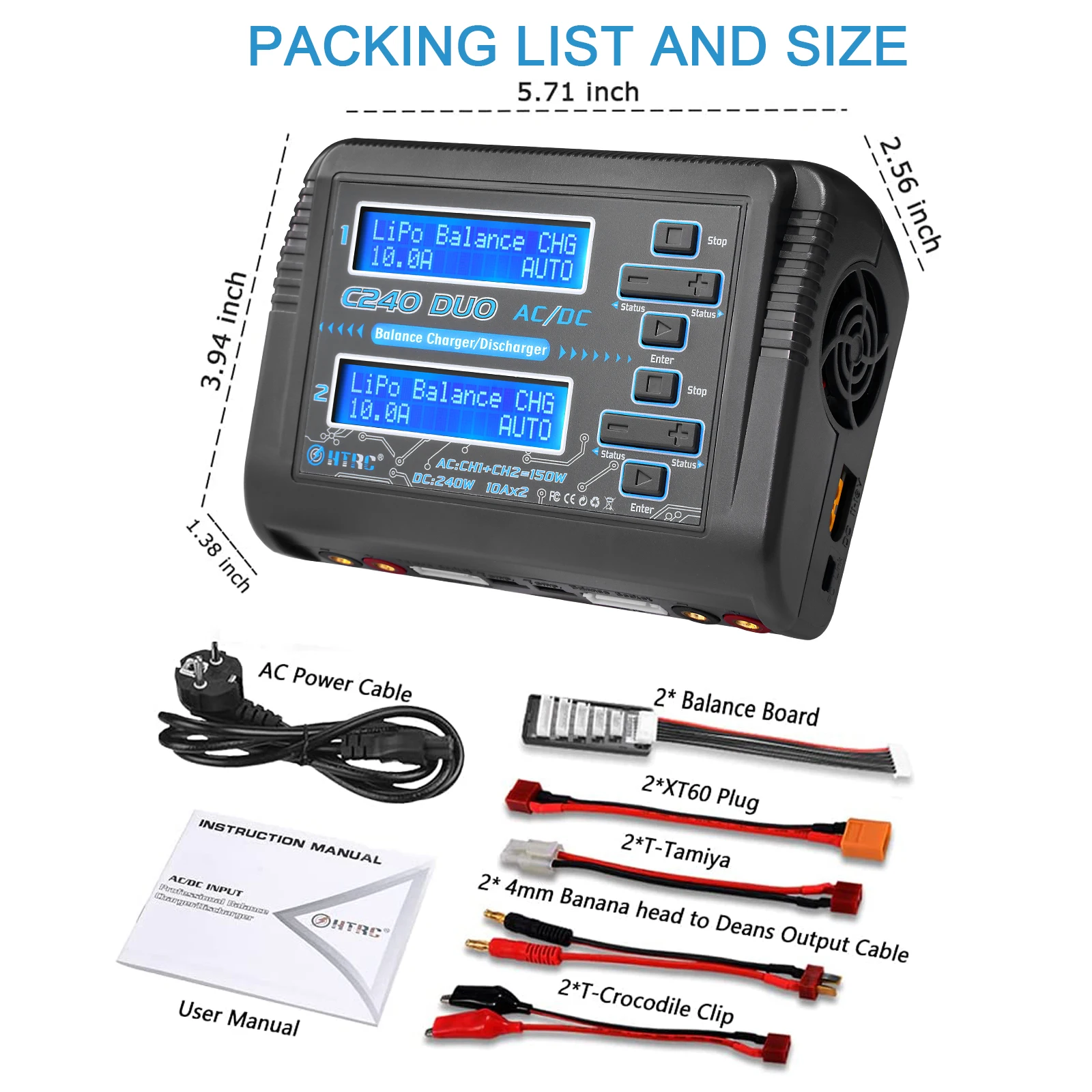 Зарядное устройство HTRC C240 Duo RC Lipo, Двухканальное разрядное устройство переменного тока150 Вт постоянного тока240 Вт, 10 А, для аккумуляторов LiPo LiHV LiFe Lilon NiCd NiMh Pb