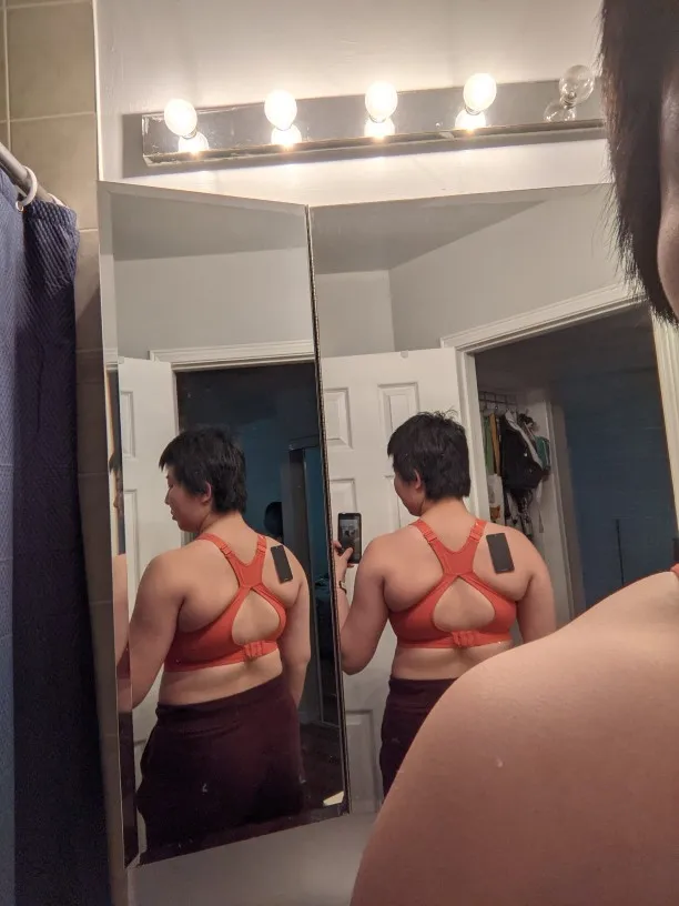 Выглядит так же, как на фото. Гладкая ткань. Немного туго, но может быть, потому что я недавно надел немного веса. Надежно удерживает грудь. Легкая подкладка. Эластичный сзади, но не спереди. Доставка в Канаду была очень быстрой.