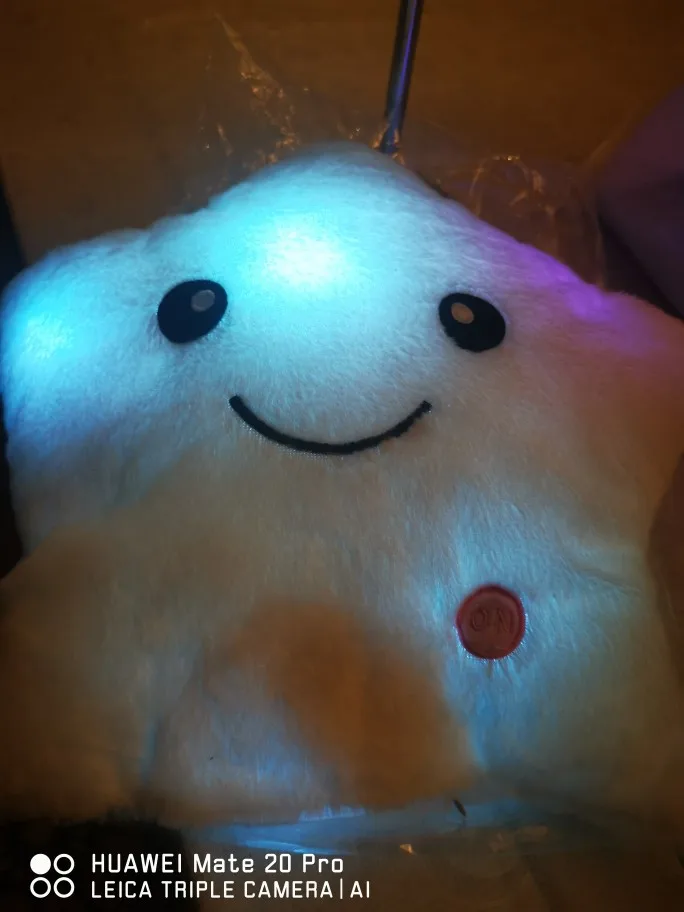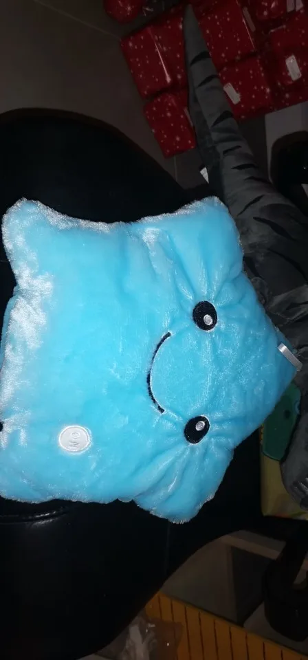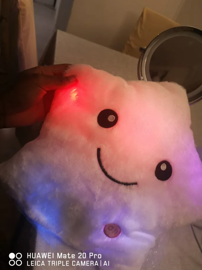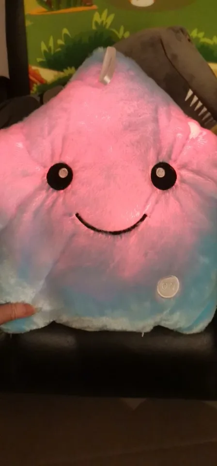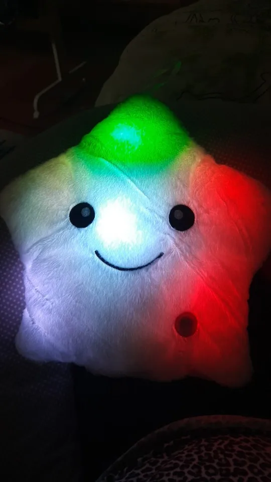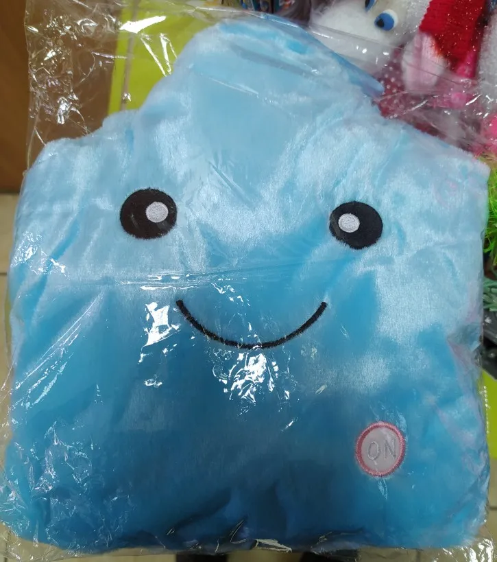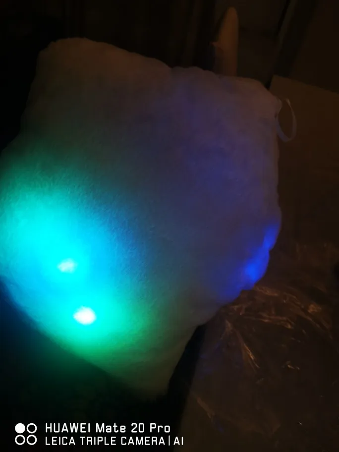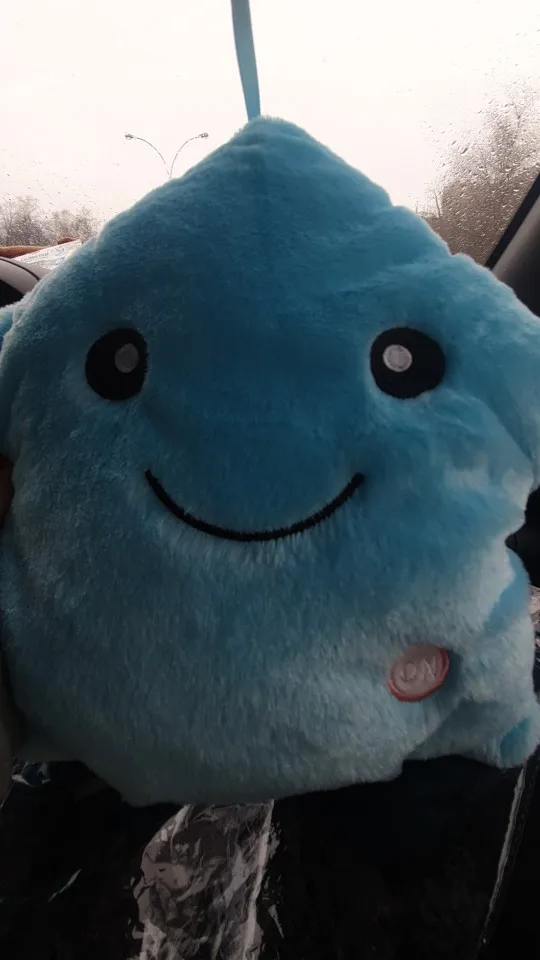 Доставка была быстрой, милая Подушка, ей нужны 3 батарейки АА, не входят в комплект, меняющие цвета и очень мягкие, моему дочке очень нравится