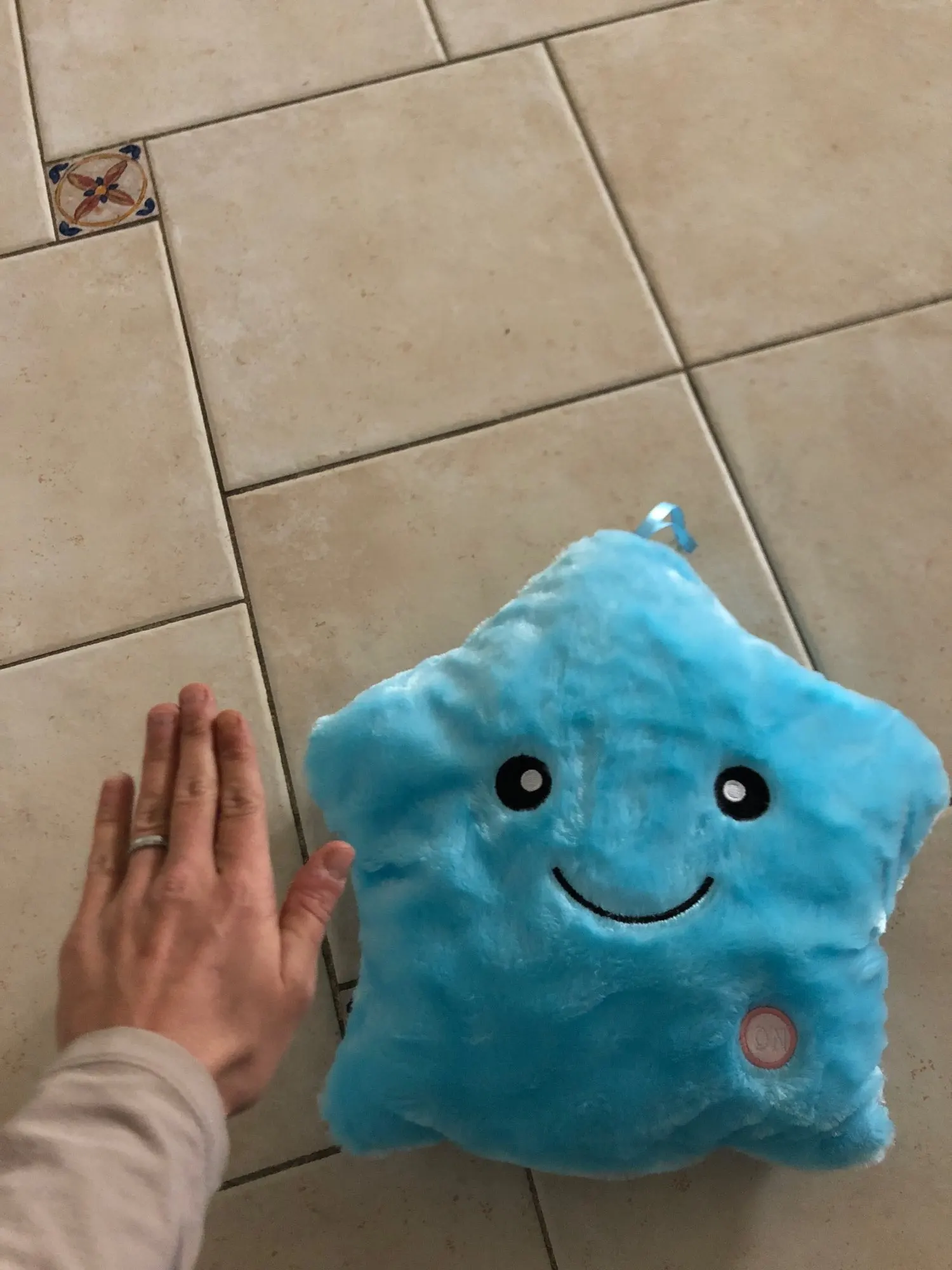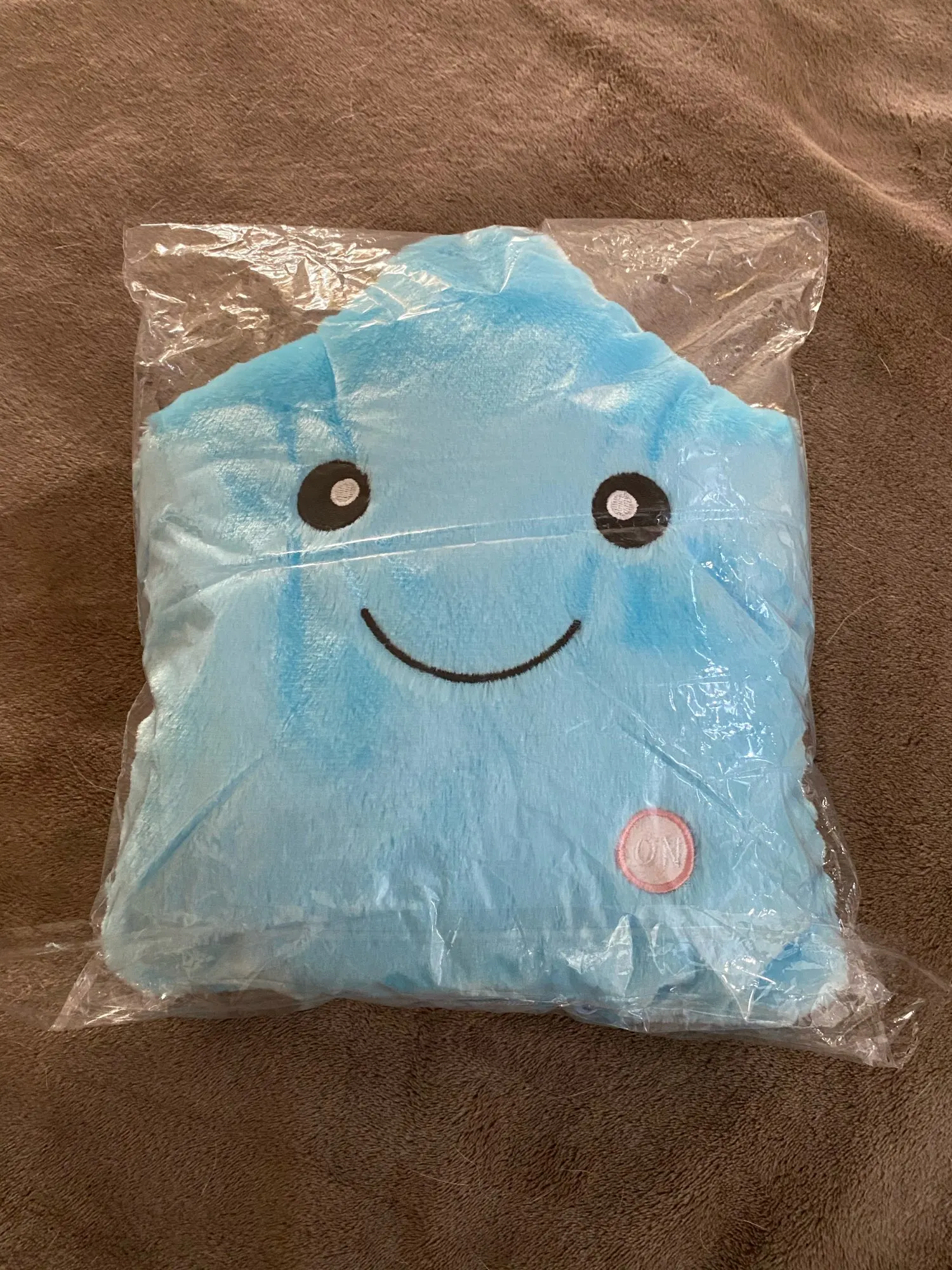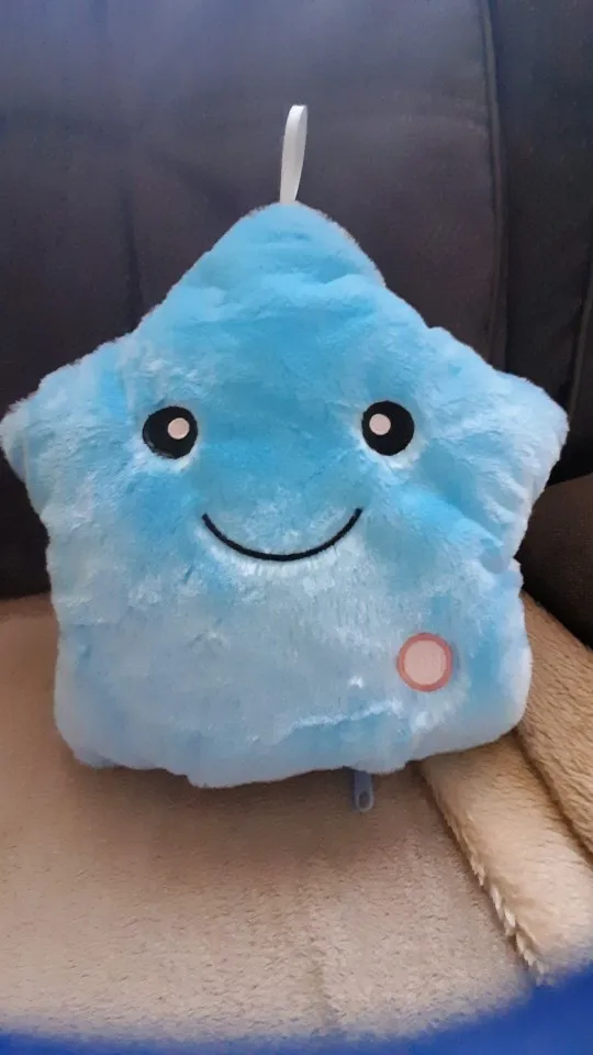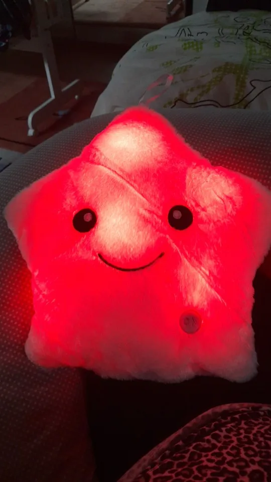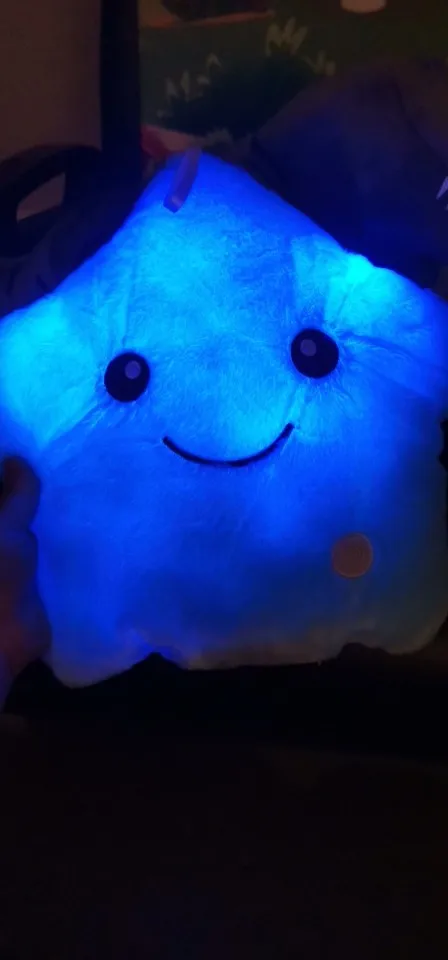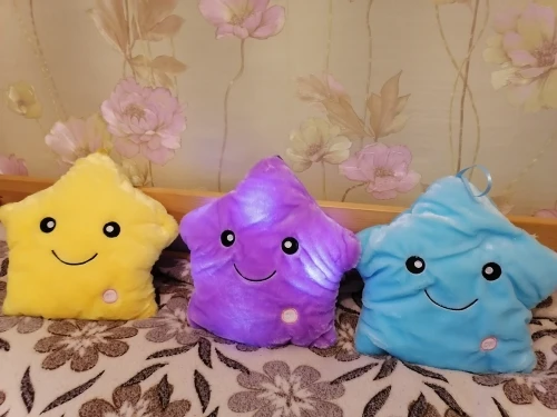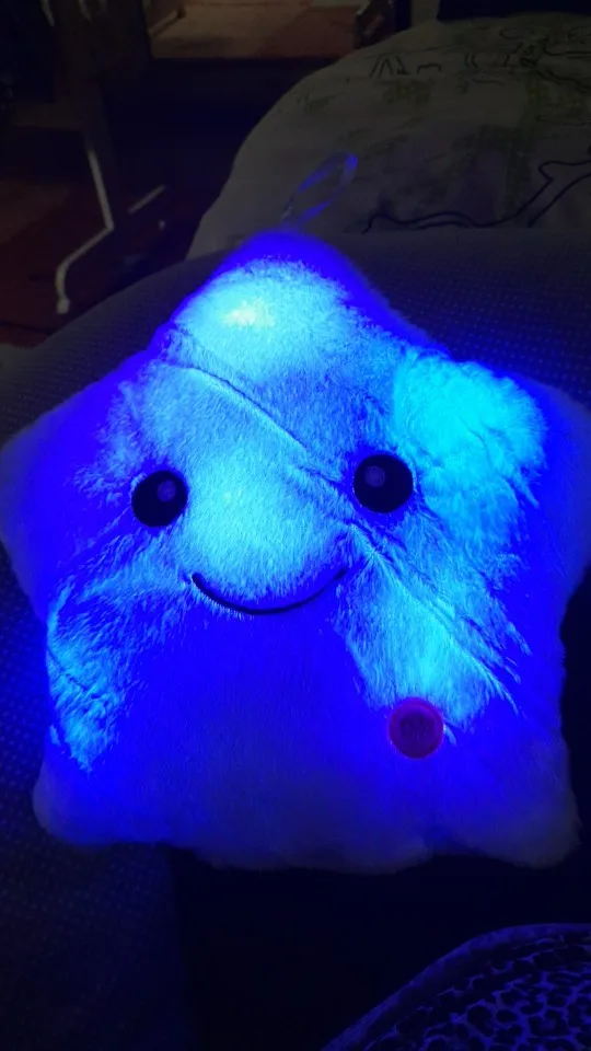 Доставка была быстрой, милая Подушка, ей нужны 3 батарейки АА, не входят в комплект, меняющие цвета и очень мягкие, моему дочке очень нравится