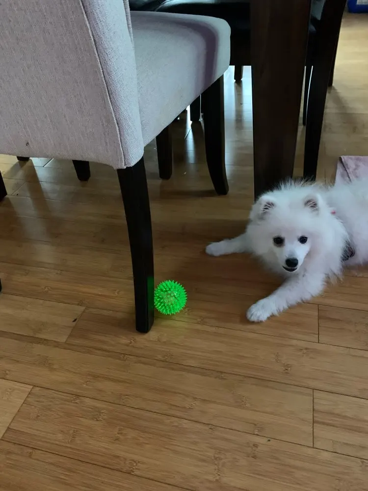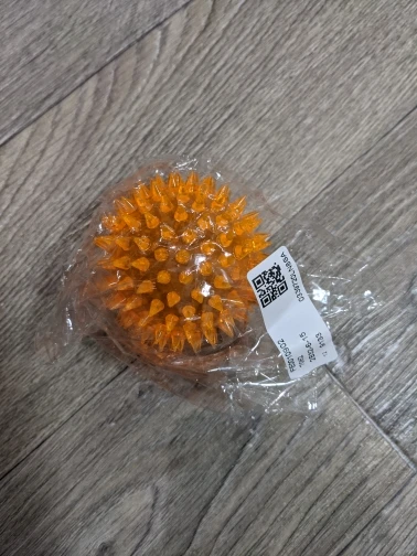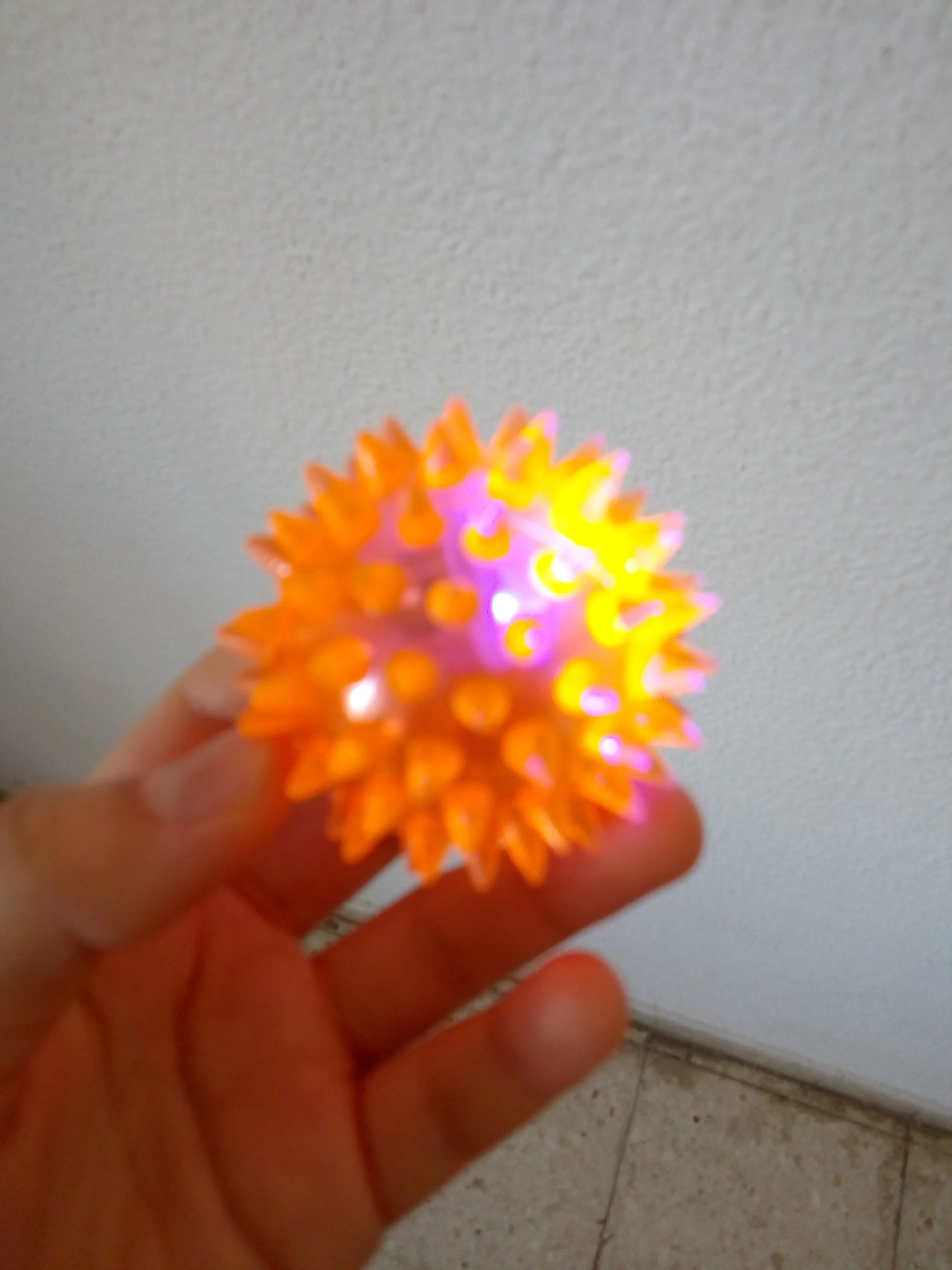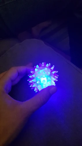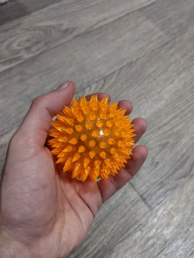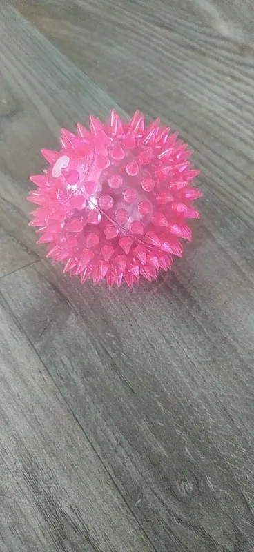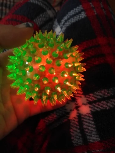 Очень мягкий мячик с шипами, внутри маленький светящийся мячик. Для игры с собакой не подходит - собака быстро прокусит большой мягкий мячик и проглотит маленький. Но цвет красивый