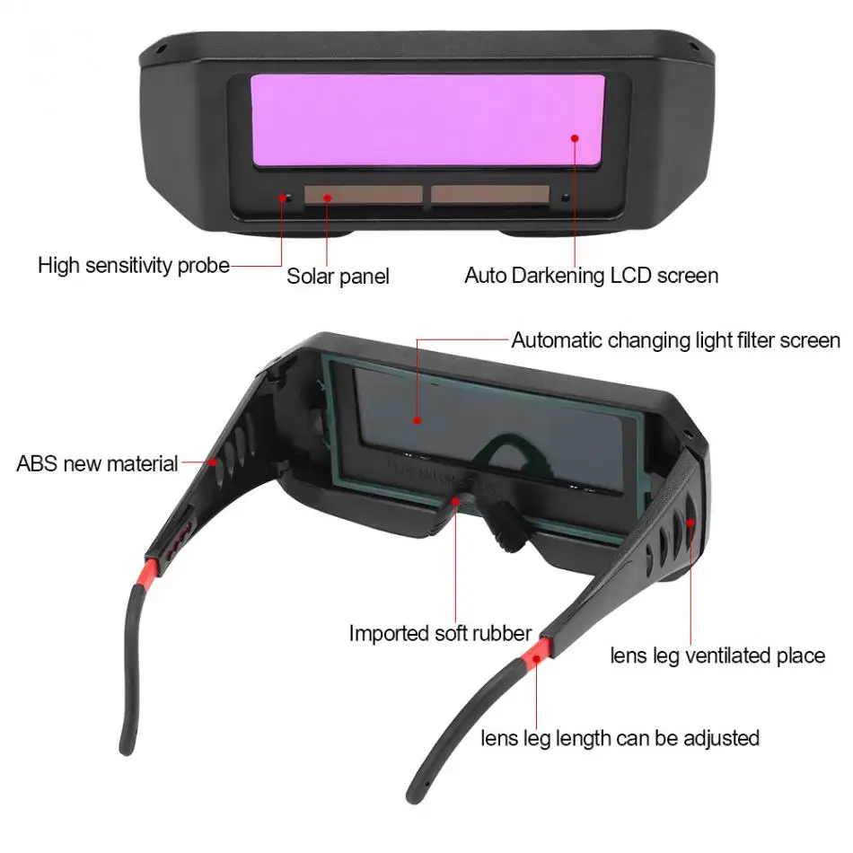 Эти солнечные самозатемняющиеся сварочные очки отличаются анти-ультрафиолетовым, инфракрасным излучением, антибликовым покрытием. Сварочные очки с регулируемым оттенком предназначены для защиты глаз от искры и вредного излучения при нормальных условиях сварки. Автоматический затемняющий фильтр автоматически изменяется из состояния светильник в темное состояние при ударе дуги и возвращается в состояние светильник при остановке сварки. Солнечные батареи, никаких изменений батареи не требуется. Легкий и безопасный в эксплуатации, светильник с весовым дизайном. ОчкиРамки можно регулировать. Автоматическая переменная светильник линзы светильник вес и удобная, с Улучшенная удропрочность, использование более безопасной и гарантированной. Подходит для: газовой сварки, сварки стали, резки, сварки и так далее.