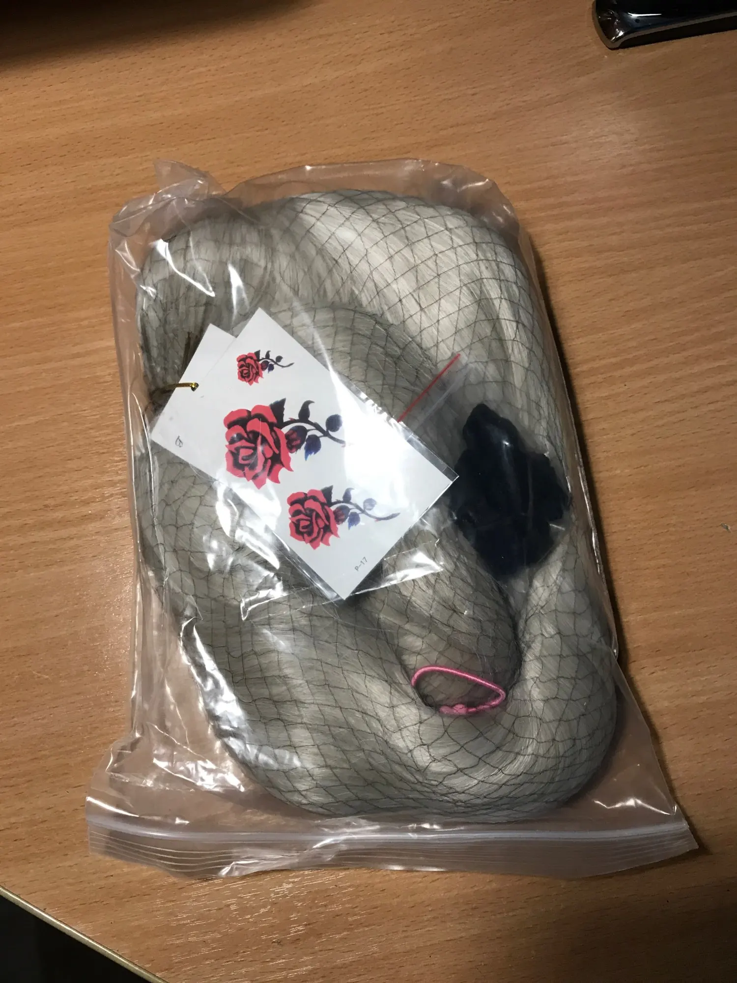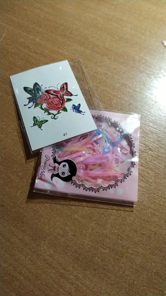 с париком положили пакетик маленьких резиночек, переводную татуировку и шапочку