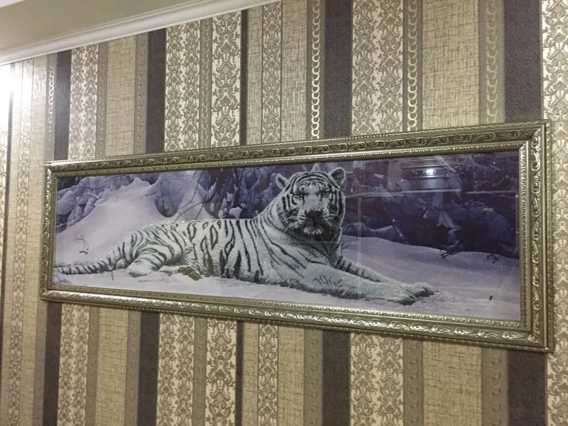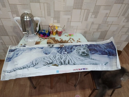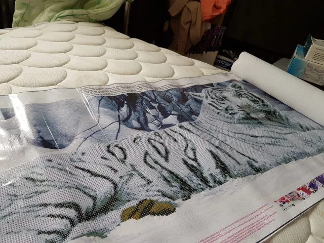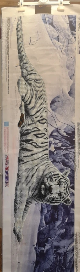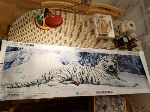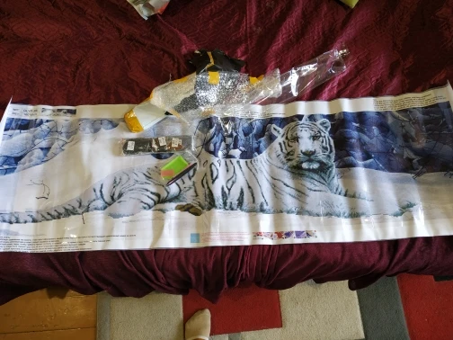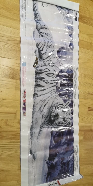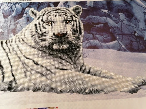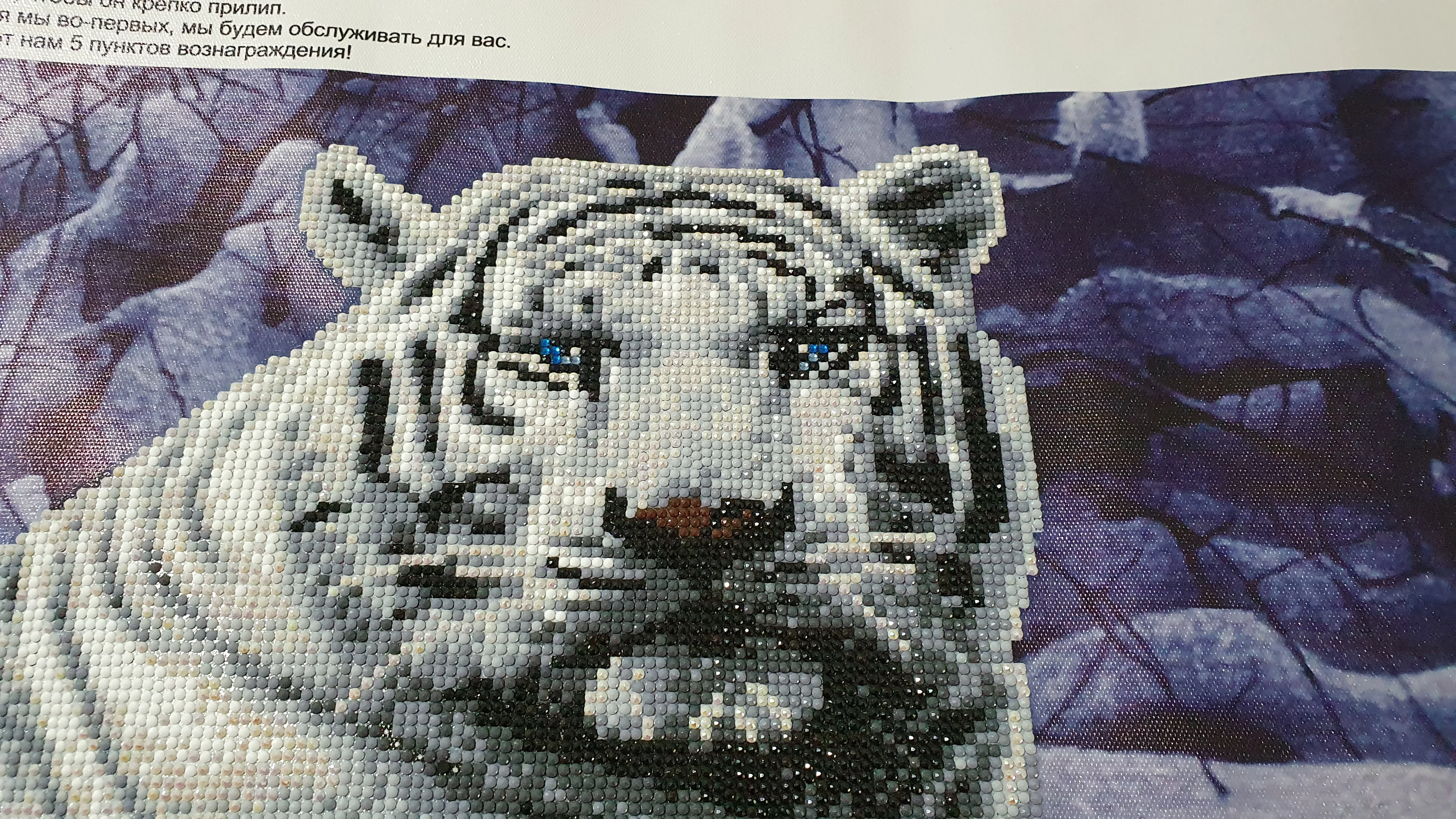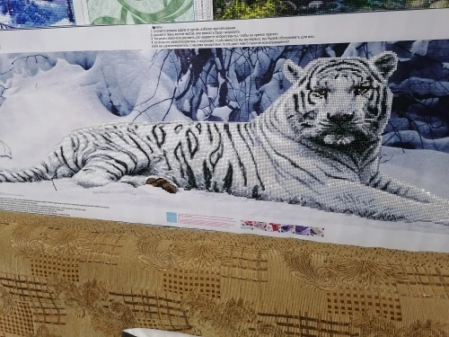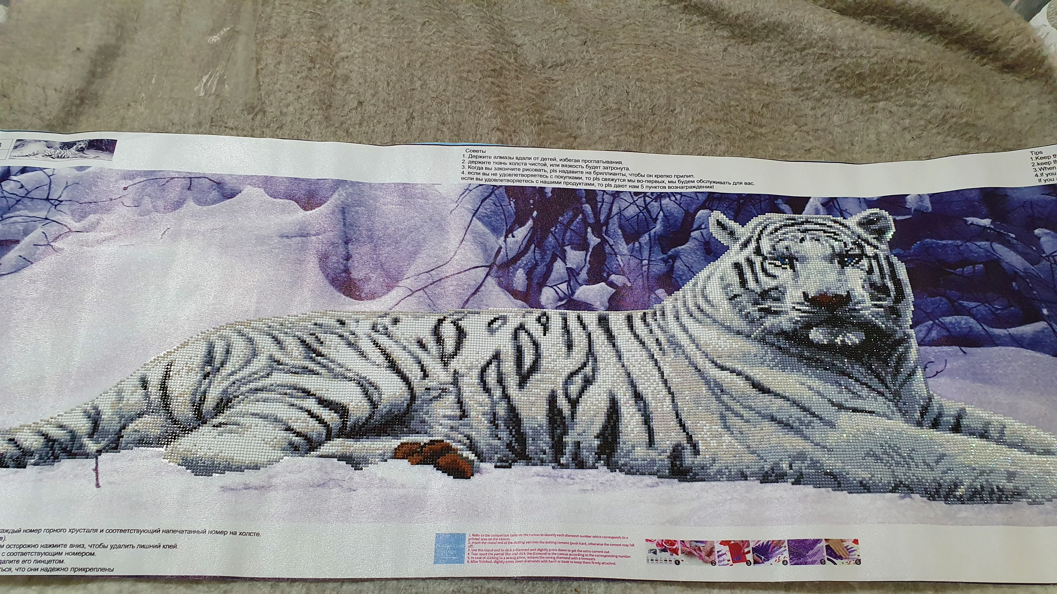 Посылка пришла за две недели. полотно просто скручено, без валика, но сильных заломов нет. Тигр шикарный, огромный. Страз много, надеюсь хватит. Один вид страз перламутровые, очень сильно блестят, на фото не передается этот блеск. Пропечатка символов хорошая. Выкладывается только тигр. Картиной довольна, берите, не пожалеете