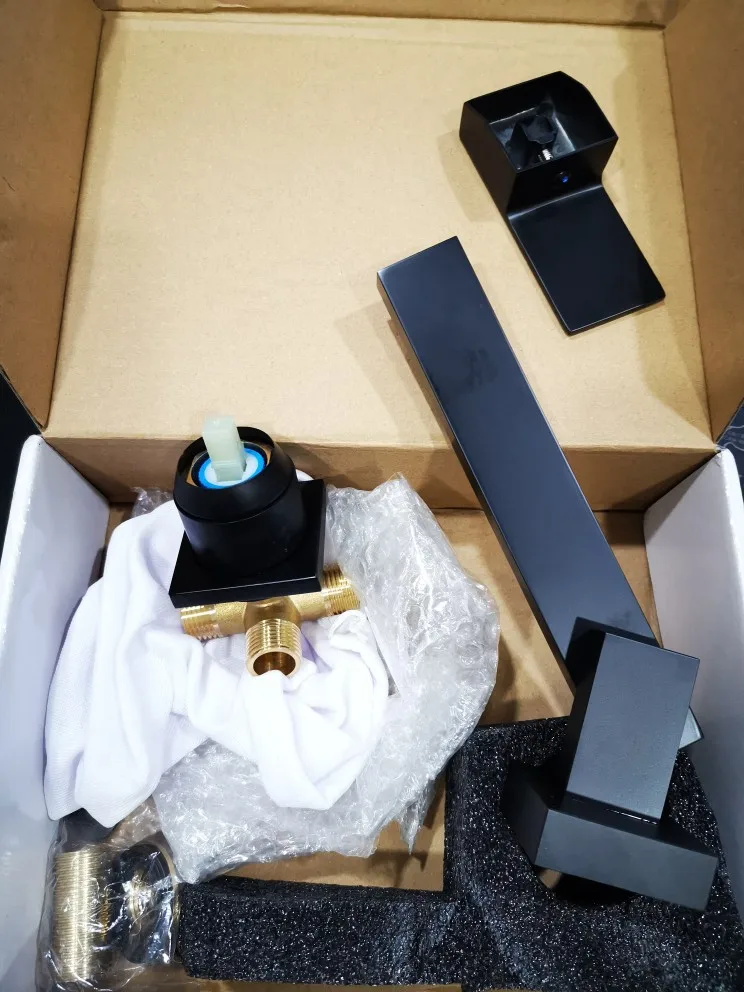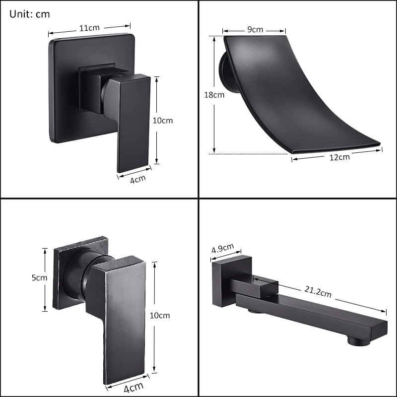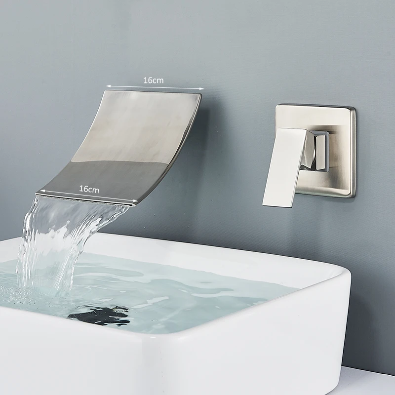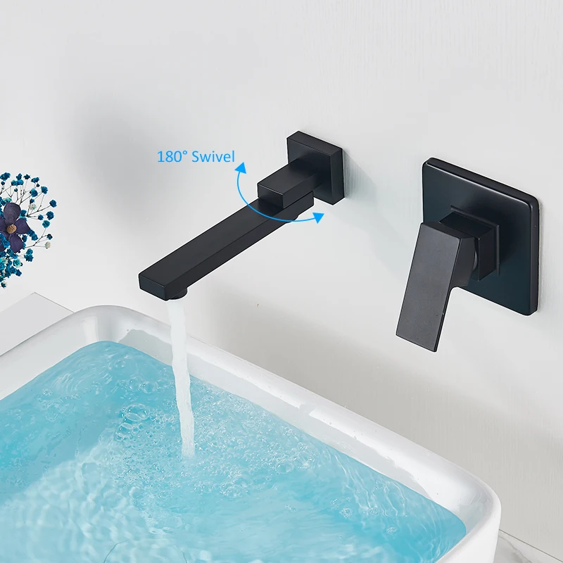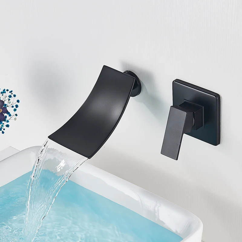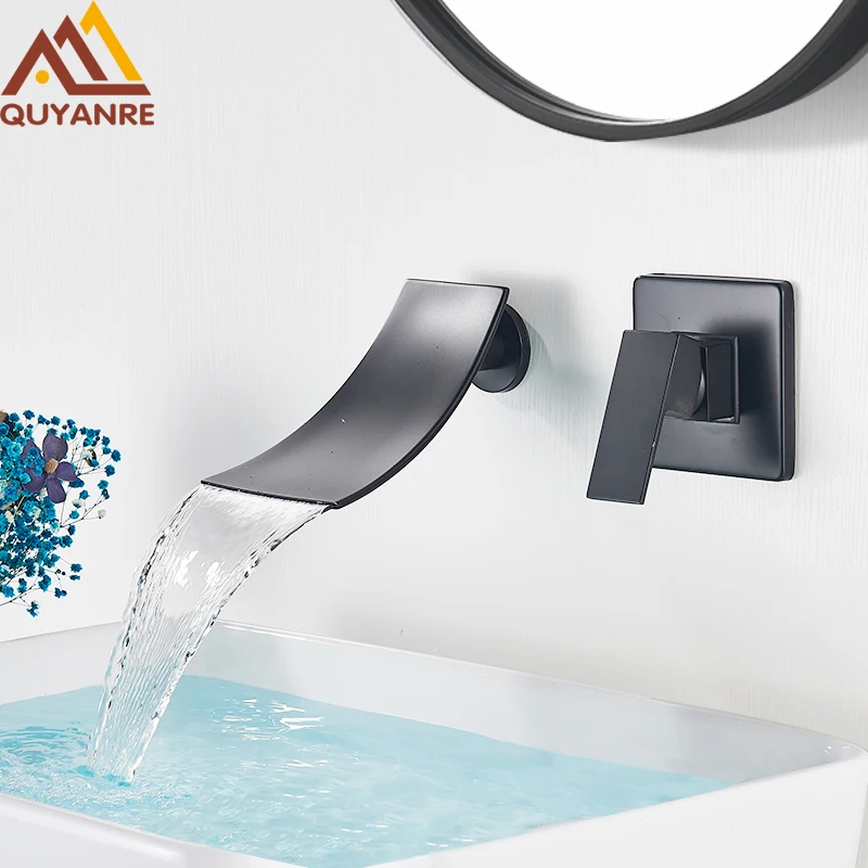 Смеситель для раковины Quyanre, черный хромированный, настенное крепление; Водопад