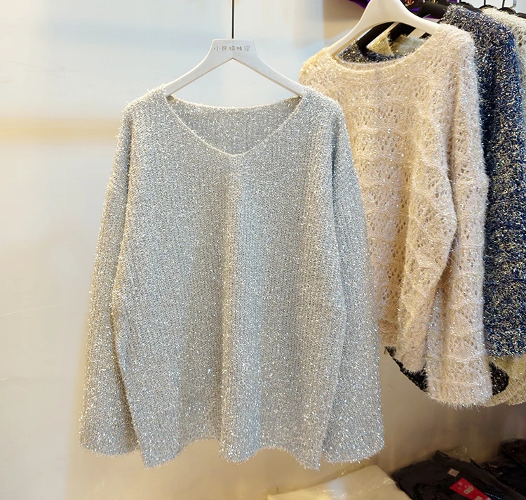 Женский трикотажный джемпер с люрексом Cakucool, золотистый Свободный пуловер с длинным рукавом-фонариком и V-образным вырезом, осенний свитер
