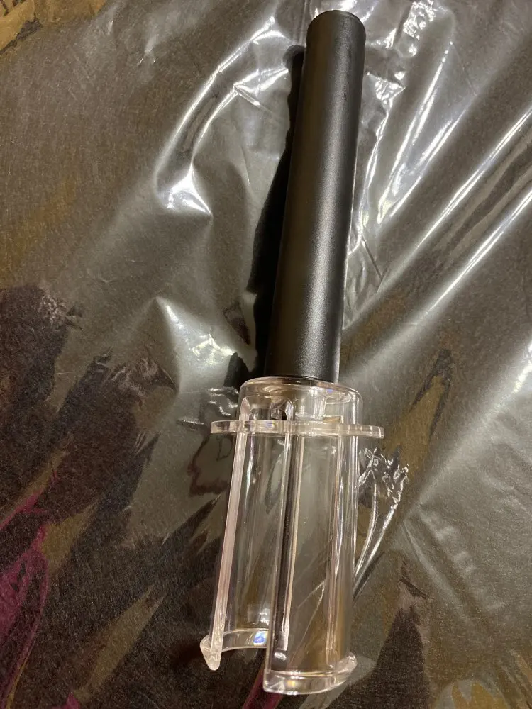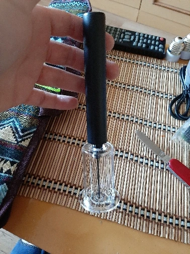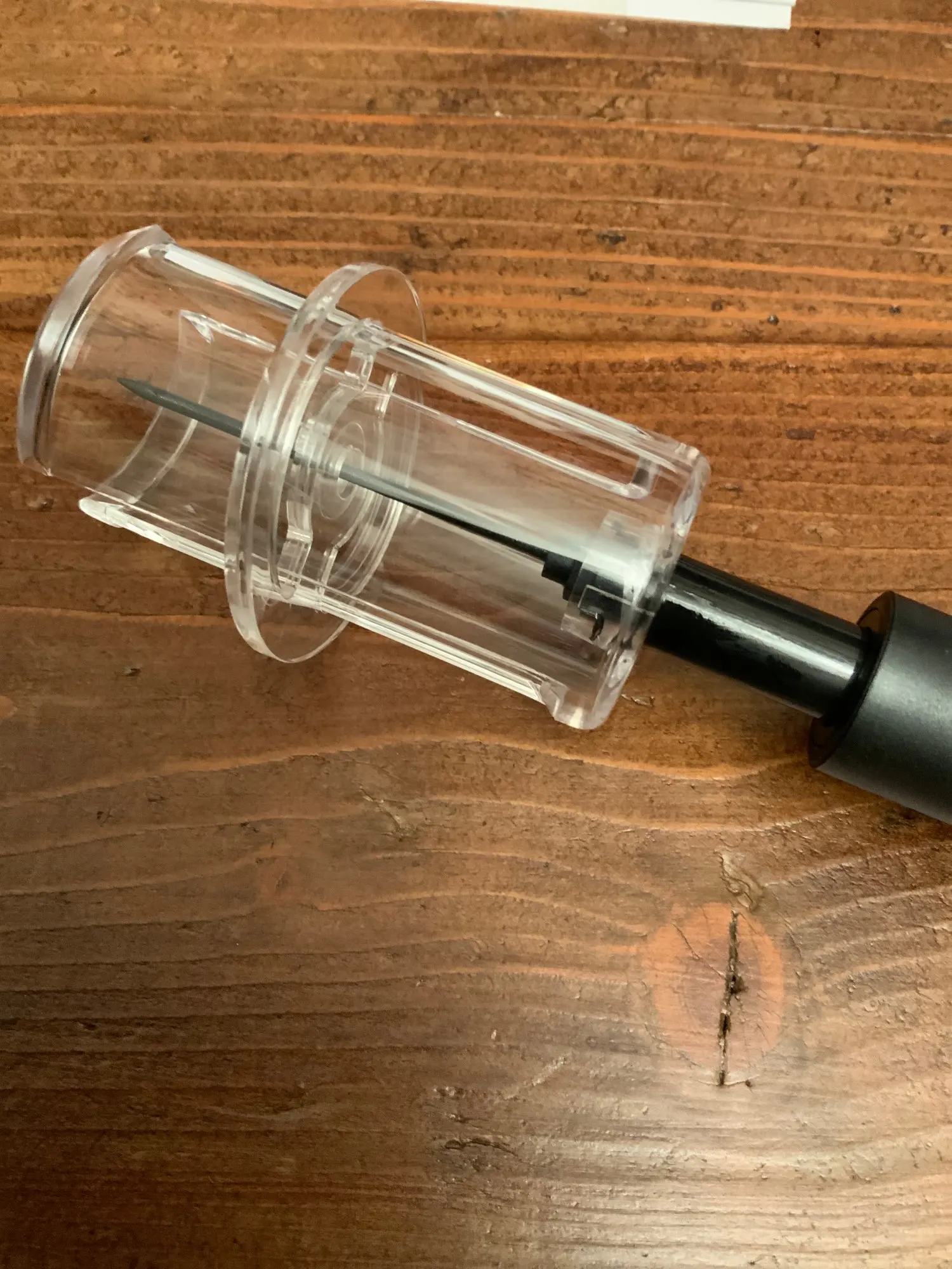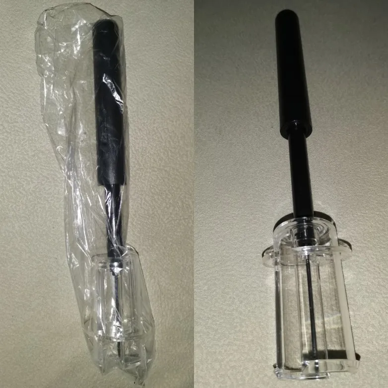 Интересный штопор, работает прекрасно, но по-разному, в зависимости от типа винной пробки. Аккуратно, жало иглы немного торчит за пластиковую защиту.