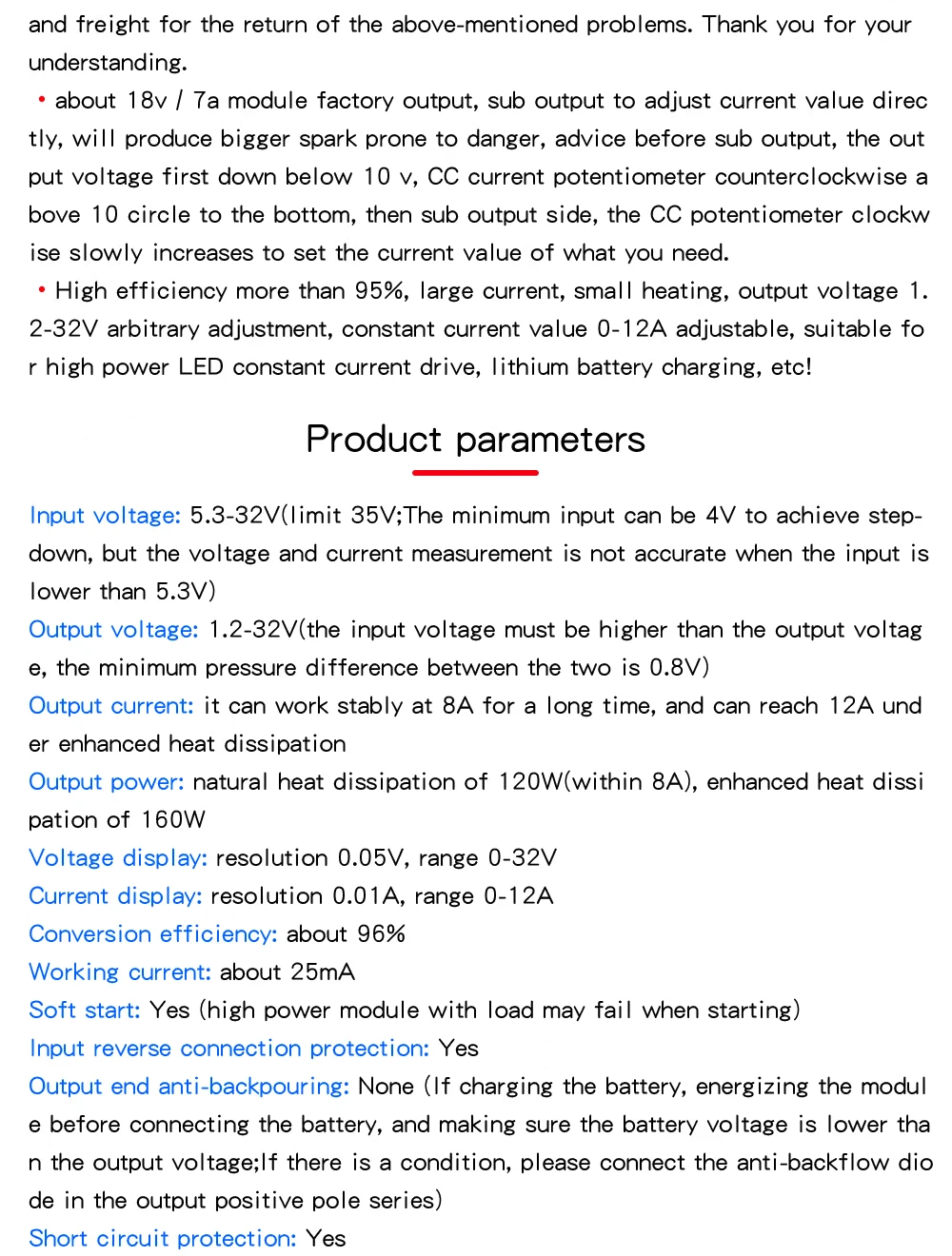 Не знаю о каких 12-ти Амперах идет речь. Заряжал полчаса два 3х тысячных суперконденсатора подключенных в параллель током 7 Ампер. Преобразователь греется прилично. Вообще на длительную работу лучше больше 5-ти Ампер не давать. В качестве источника использовал блок питания от ноутбука. 12 ампер может быть и вытянет, но проработает недолго. А так для зарядки суперкондеров годится. Цена самая низкая во всем Китае. Пять звезд.