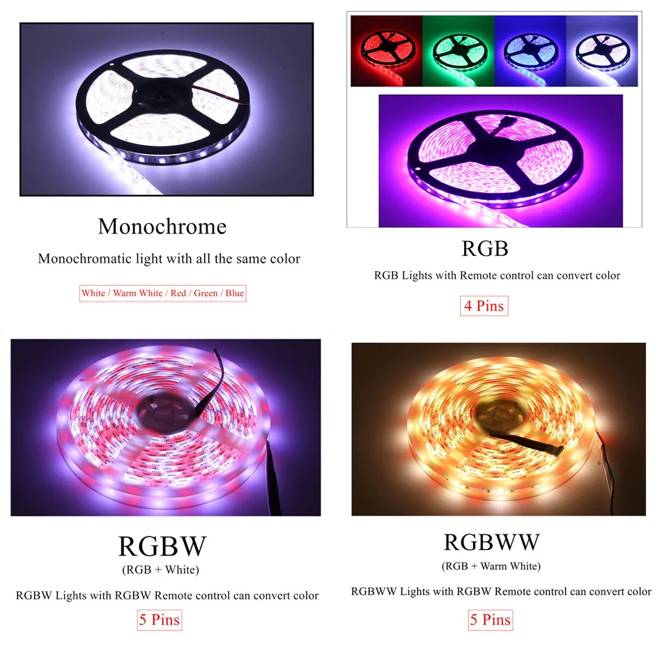 Характеристики: • Модель чипа: SMD 5050 • Цвета: Белый / RGB / RGBW / RGBWW • Степень защиты: IP20 неводонепроницаемый / IP65 водонепроницаемый • Рабочее напряжение: 12 В постоянного тока • Количество светодиодов: 60 светодиодов/м, 5 метров/рулон • Угол обзора: 120 ° ~ 140 ° • Рабочая температура: От -20 ° до 50 ° • Цветовая температура: Теплый белый: 3000-3500K, Белый: 6000-6500K • Класс водонепроницаемости: IP20 / IP65 • Блок питания: 3 A, 36 Вт • Дистанционное управление: 44 кнопки / 40 кнопок