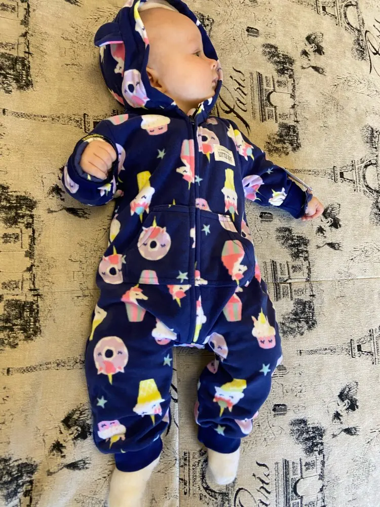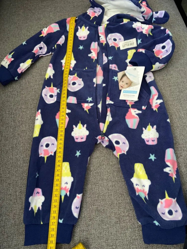 комбез классный, но узковатый. брала размер 24м. на ребенка 11месяцев как раз в ширину. в длинну чуточку большиват.