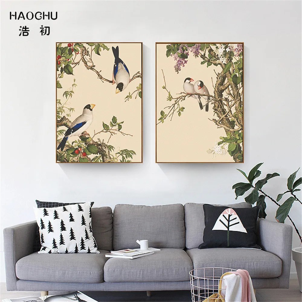 Новые настенные картины HAOCHU в китайском стиле с птицами и цветами, Картина на холсте, настенная живопись, постер, украшения для дома, учебы, кафе
