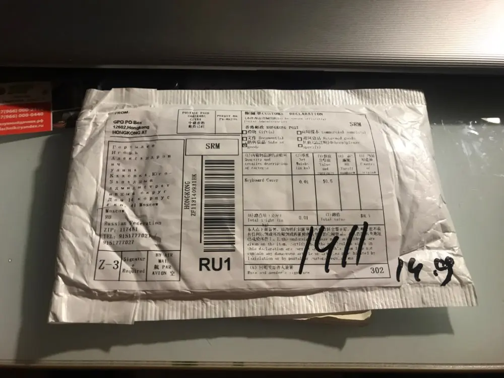 шла довольно долго. в упаковку была приклеена к картонку с инструкцией, из-за чего на ней остался синий. полностью на клавиатуру плохо ложится