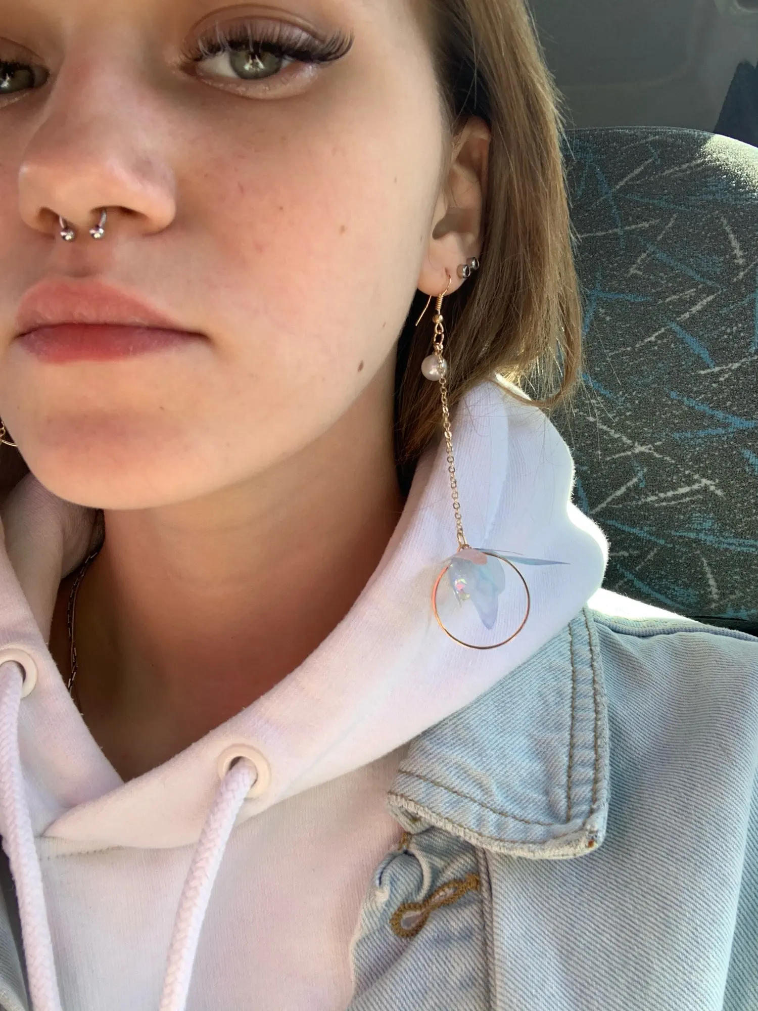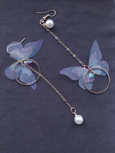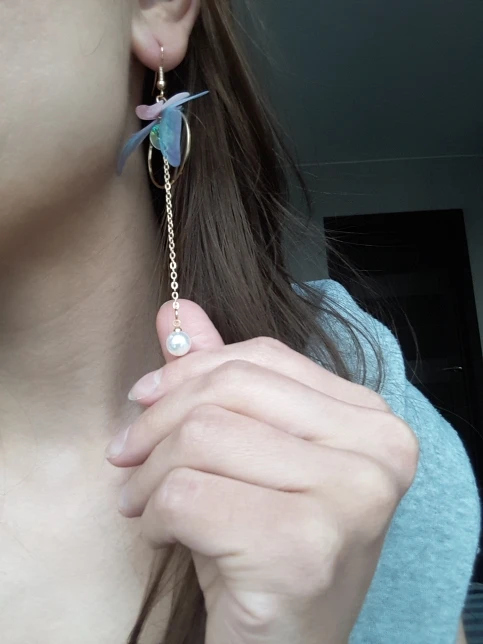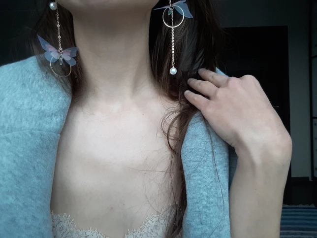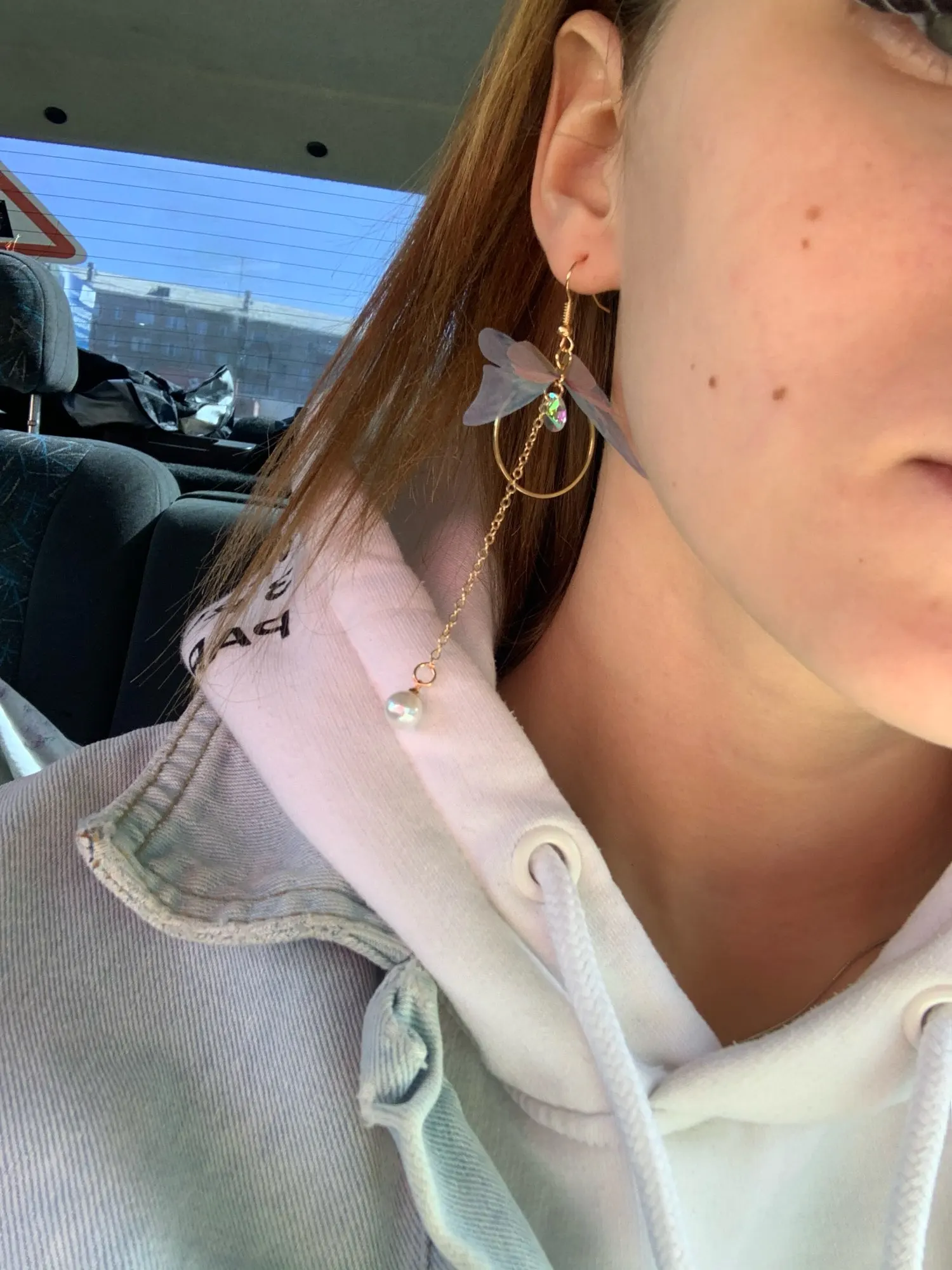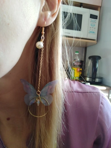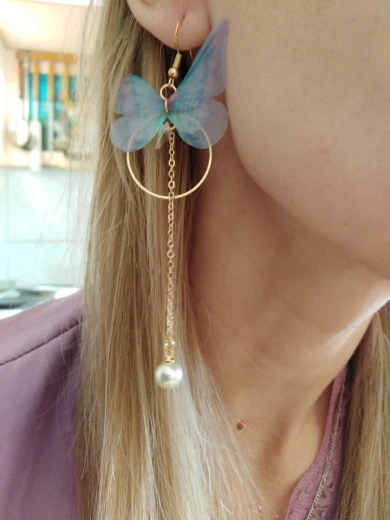 Бабочки, конечно, живут своей жизнью, особенно та, что прямо у мочки, переворачивается, крутится, задевает шею и порхает крыльями, как ей заблагорассудится) но они такие милые и нежные, что пусть порхают) рекомендую этих воздушных малюток)