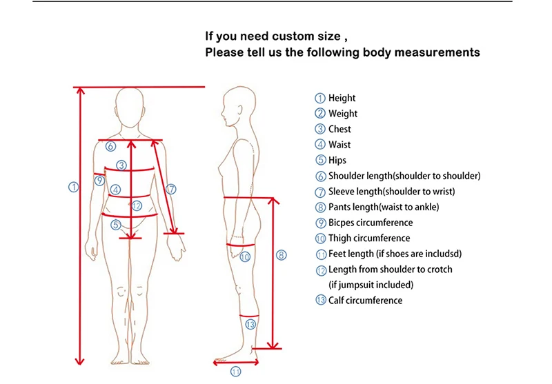 Костюм может быть изготовлен по индивидуальному заказу, поэтому, пожалуйста, сообщите нам размеры бюста, талии, бедер и роста после завершения заказа. Наш портной сделает его по размеру, который вы предоставили. Большое спасибо.