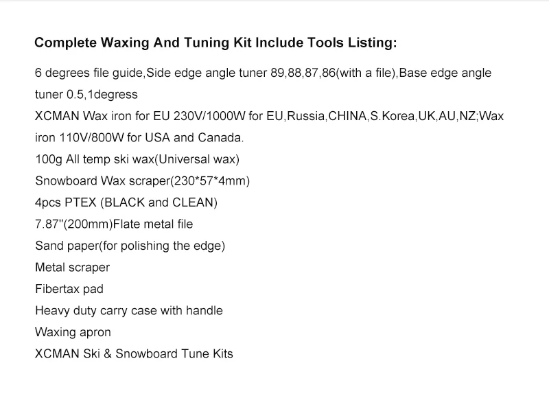 Этот комплект отлично работает. Сумела закрепить сноуборд, который был в реальной плохой форме и воска второй. У меня достаточно воска для еще 2 видов применения. Идеально подходит для глажки кромок и утюга. Металлический скребок тоже очень хорош. Полный комплект стоит своей цены, особенно если вы сравните цену с аналогичными комплектами на Amazon. Два больших пальца для XCMAN, потому что я уверен, что это прослужит несколько лет! Большое спасибо за быструю доставку. Доставка в Канаду занимает около 2 недель или немного больше. Более чем доволен продуктом.
