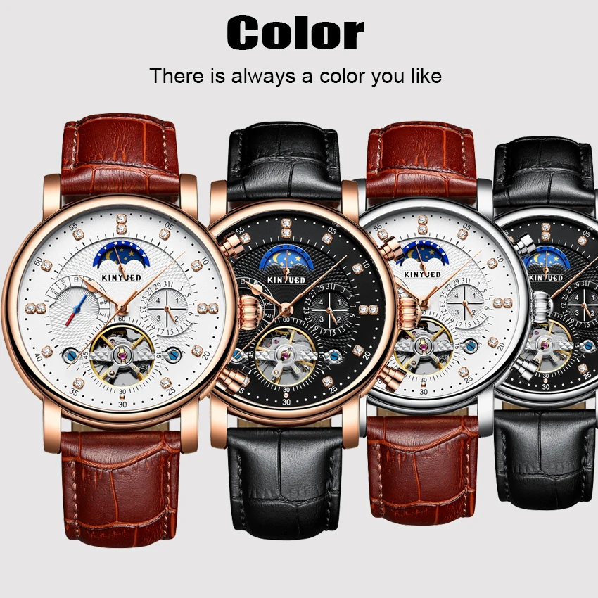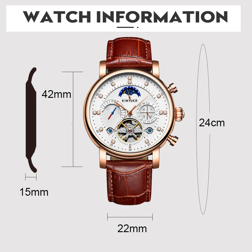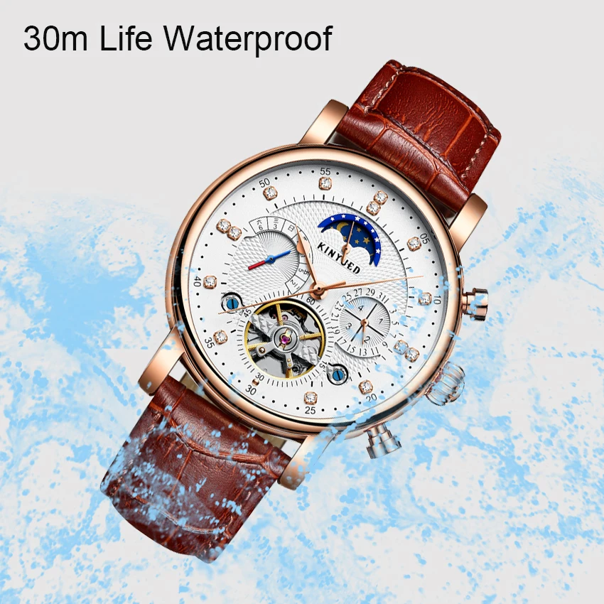 Автоматические Мужские часы с турбийоном KINYUED, роскошные модные брендовые механические часы-скелетоны с Лунной фазой, мужские часы цвета розового золота, Reloj 2019