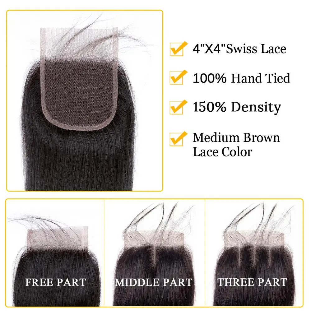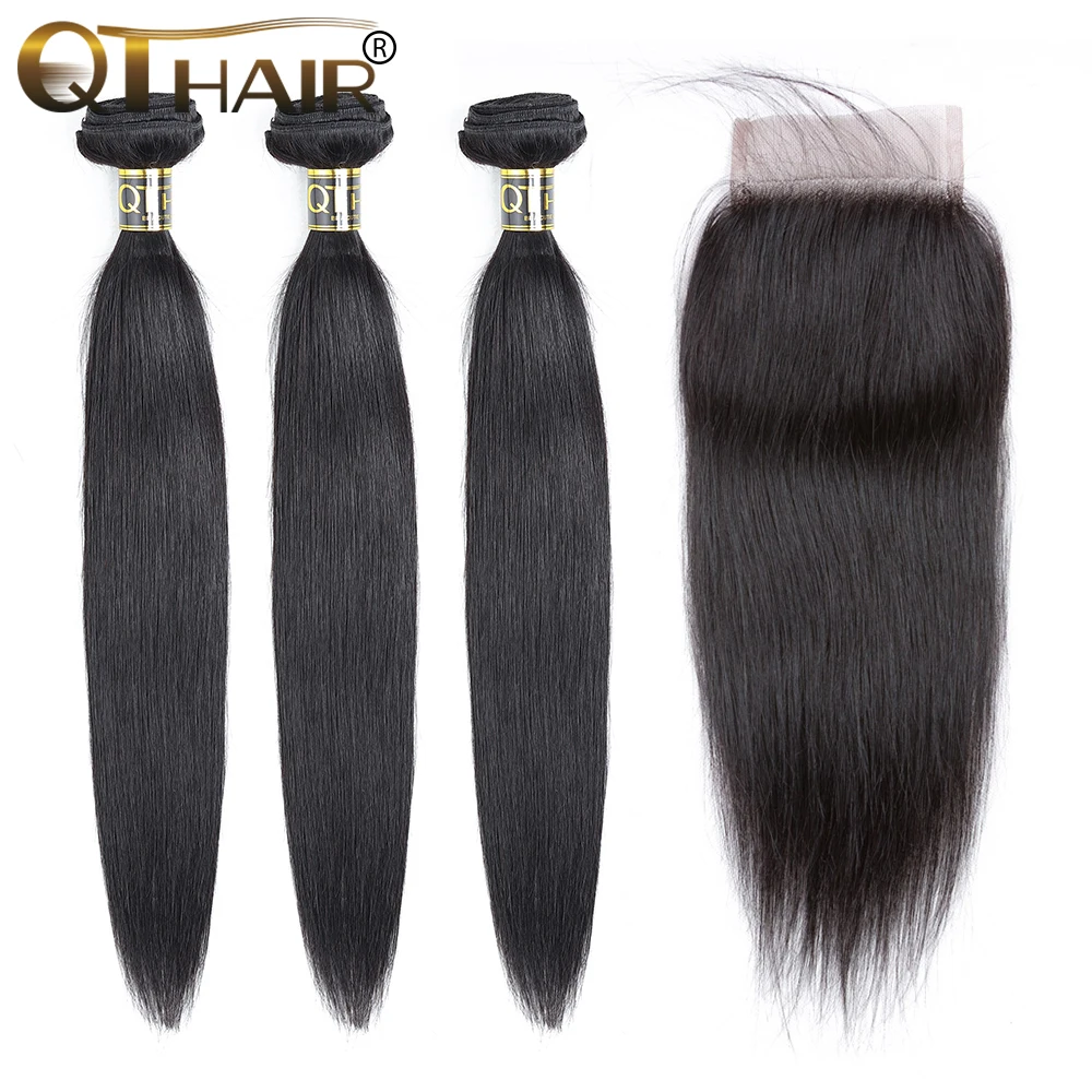 Прямые пучки волос с закрытием QT волосы Remy человеческие пучки волос с закрытием бразильские пучки волос с закрытием