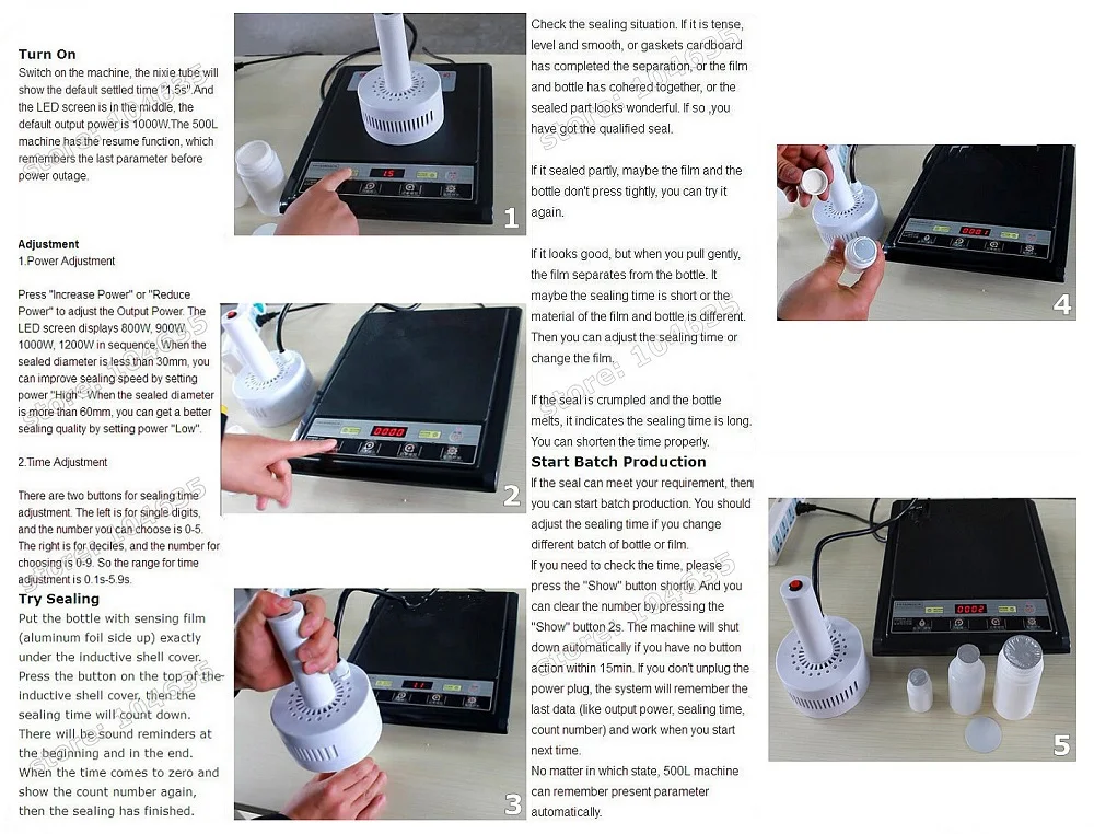 Широкий диапазон использования напряжения. Идеальный эффект герметизации пластиковых бутылок. Стабильная производительность, длительный срок службы. Мощность уплотнения регулируется от 800 до 1200 Вт. Диаметр уплотнения 20 мм: время уплотнения около 1.5s. Уплотнение Диаметр 85 мм: Уплотнительная время работы около 0,6 s. Автоматическое нагревание, перенапряжение, защита от перегрузки по току. Управление SCM, транзистор питания IGBT, высокая мощность, низкое энергопотребление. Чем больше диаметр рта бутылки, тем меньше времени требуется для уплотнения. Автоматический подсчет запечатанного номера бутылки, эффективно контролировать номера уплотнения. Разумная конструкция. Панель проста и удобна в эксплуатации. Автоматическое выключение: без работы в течение 15 минут, машина автоматически отключится. Широко используется в качестве упаковочной машины в фармацевтической, пестицидной, смазочной и косметической промышленности.