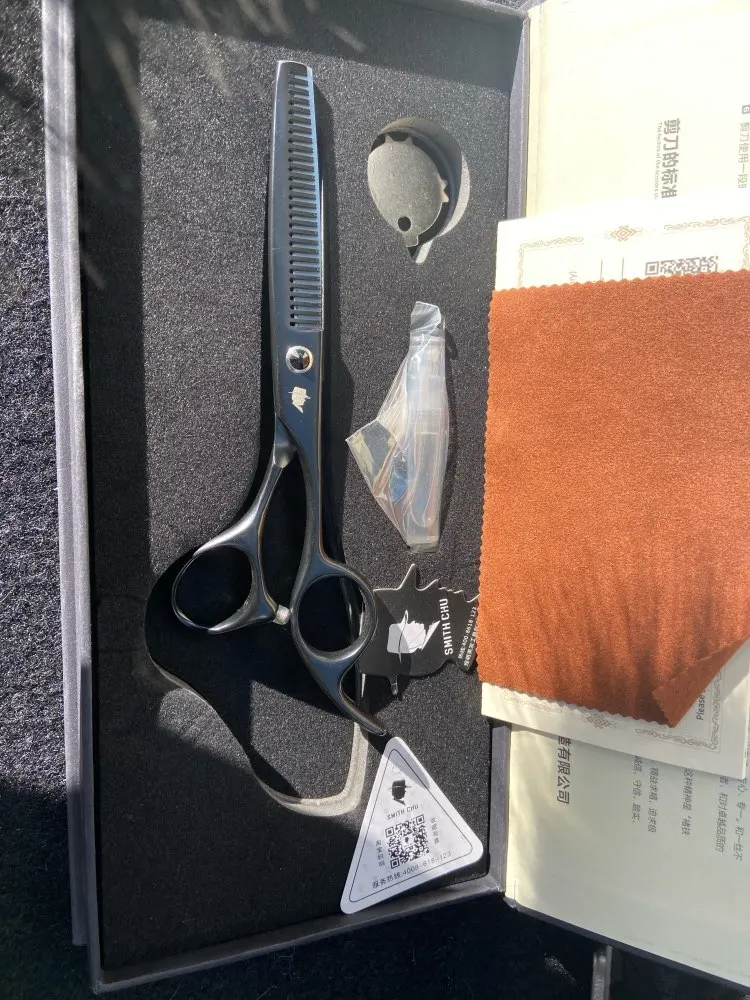 С момента заказа до получения прошло 16 дней, это супер быстро. Упакованы были хорошо, но сама коробка немного примята с одного края. Ножницы внутри лежали не плотно, т.к не влезли в специальную для них выемку, поэтому у меня сложилось впечатление, что коробка по размеру от ножниц меньшего размера. У всех на фото, смотрю, замшевая салфетка упакована в пакет, с биркой, есть сертификат соответствия...у меня же ничего этого нет. Масло... очень интересная форма - спреем. Но, пахнет отвратительно. Сами ножницы внешне очень хороши! Стричь ещё не пробовала, позже дополню отзыв.