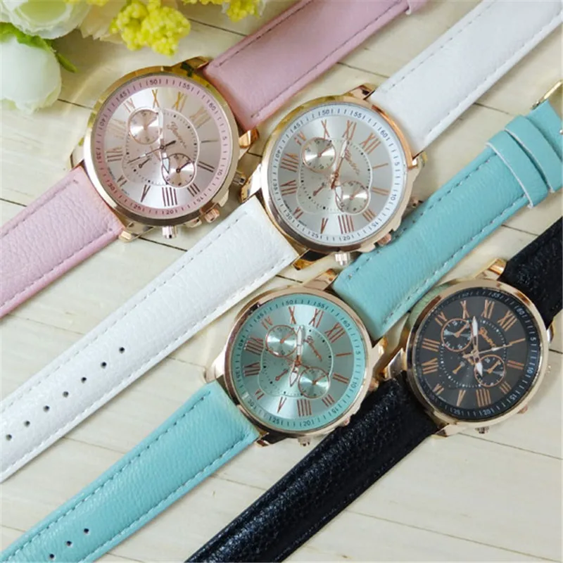 Прямая поставка, Недорогие Женские Аналоговые кварцевые наручные часы с кожаным ремешком, женские часы Geneva