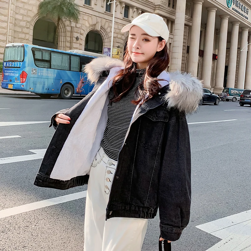 Женская джинсовая куртка большого размера с воротником из искусственного меха, зимняя куртка с рукавами летучая мышь и шерстяной подкладкой, теплое бархатное пальто с капюшоном