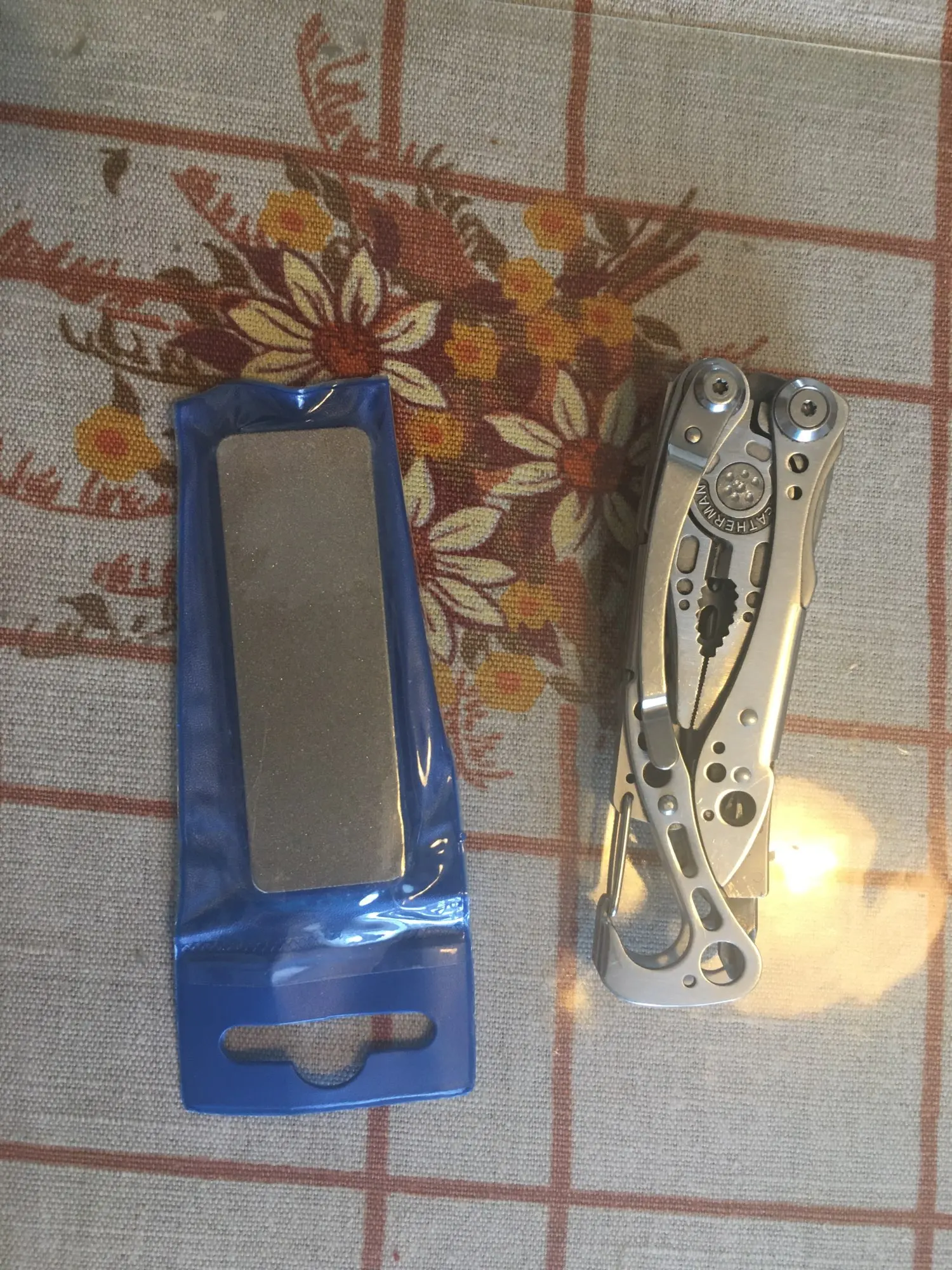 Хорошая точилка для правки лезвия в полевых условиях, описанию соответствует, алмазная сторона для правки, примерно 600-800 грит, керамическая для доводки кромки, около 1500.