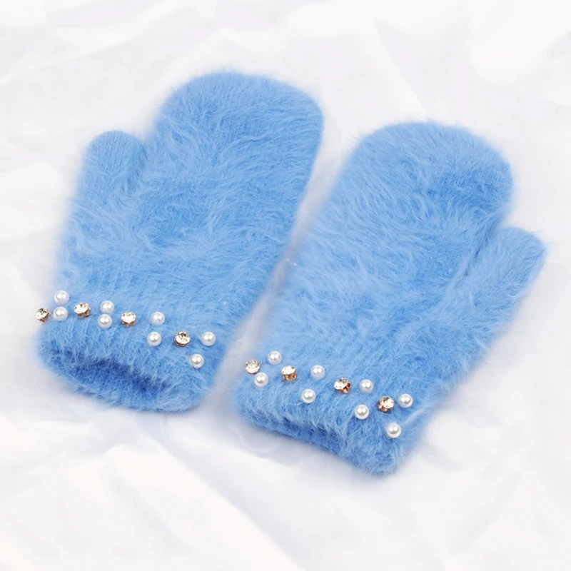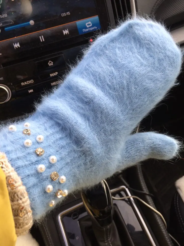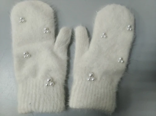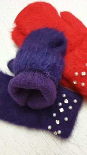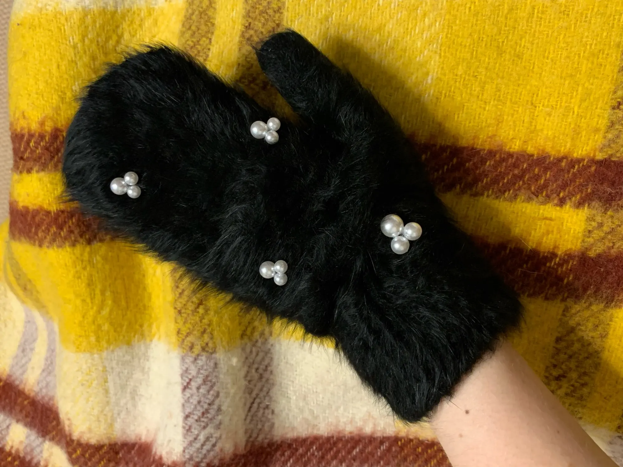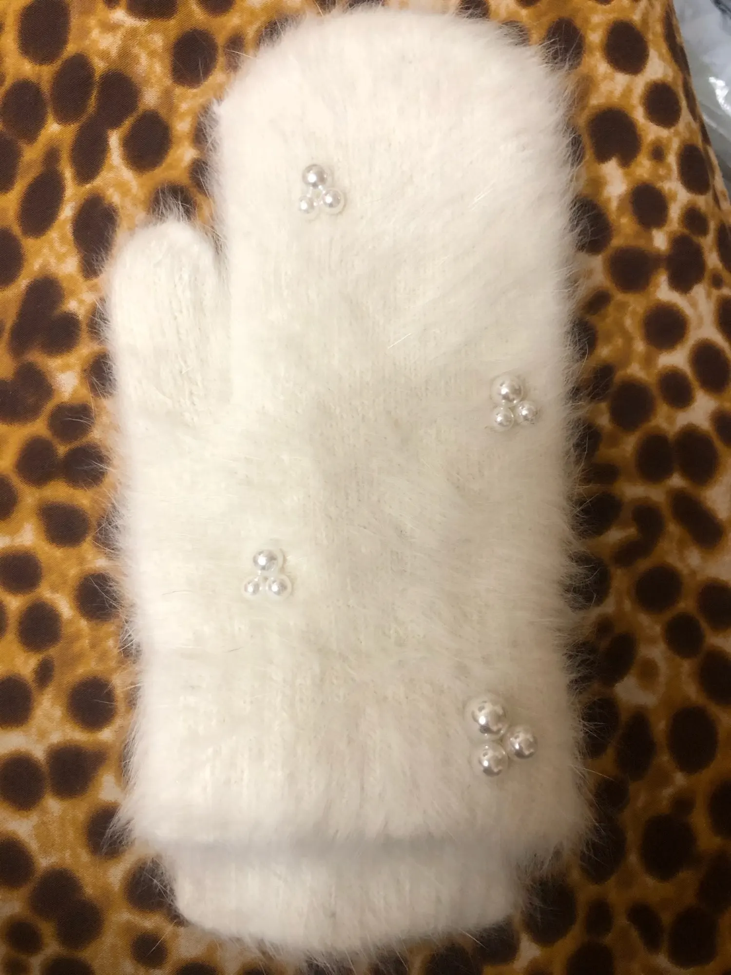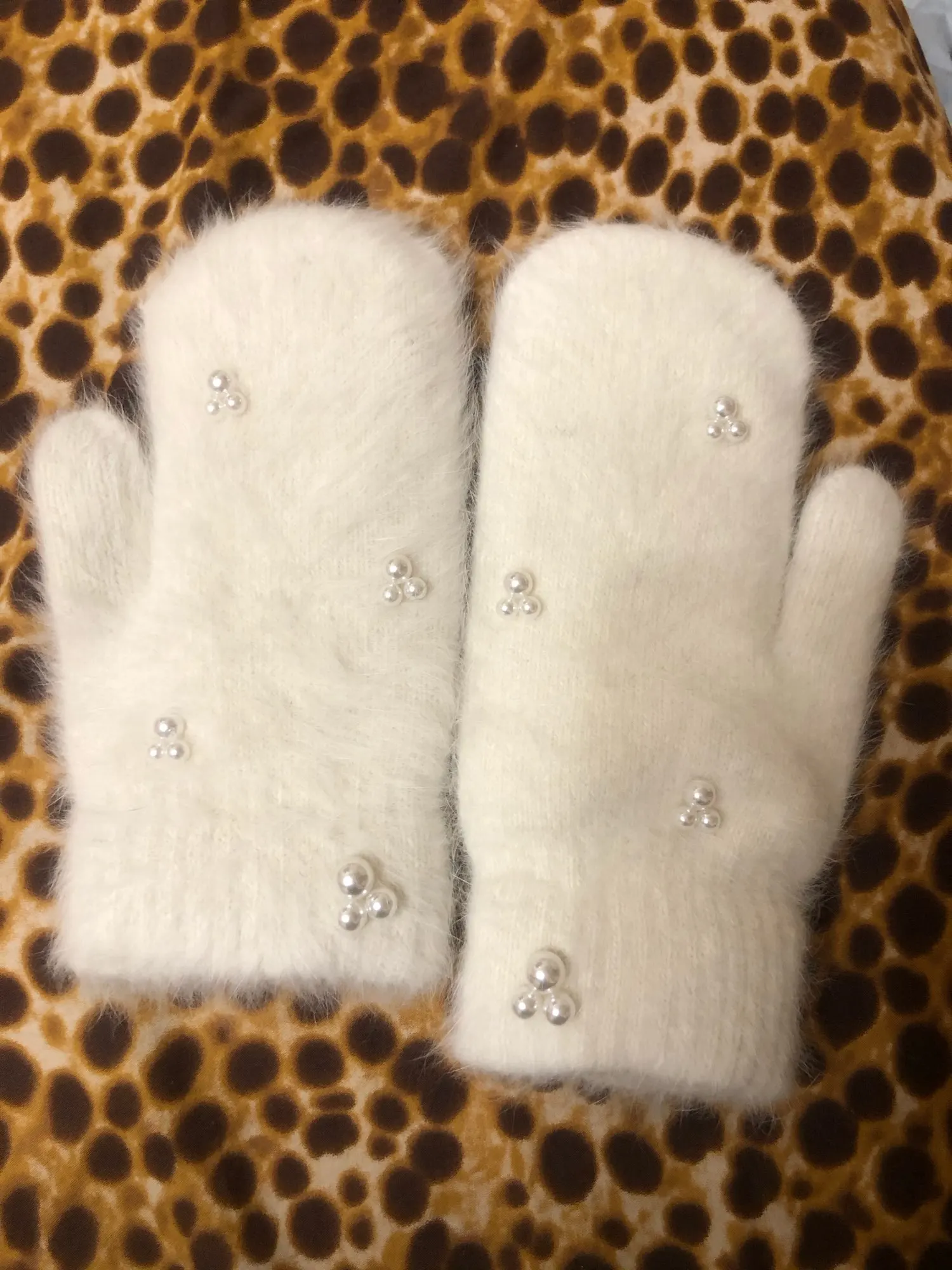 Варежки женские, зимние, из кроличьего меха, с жемчужинами