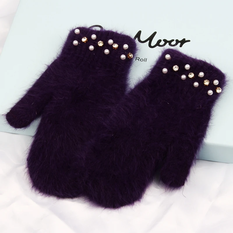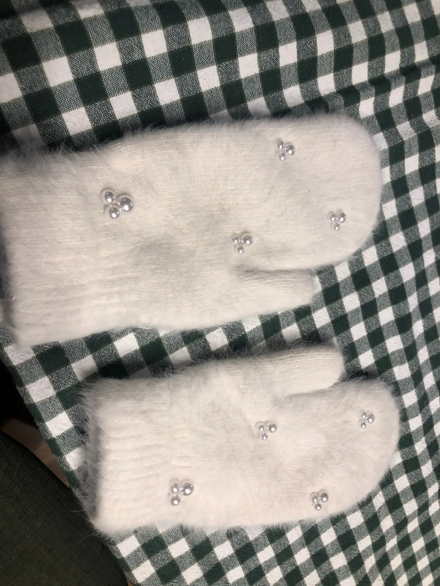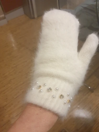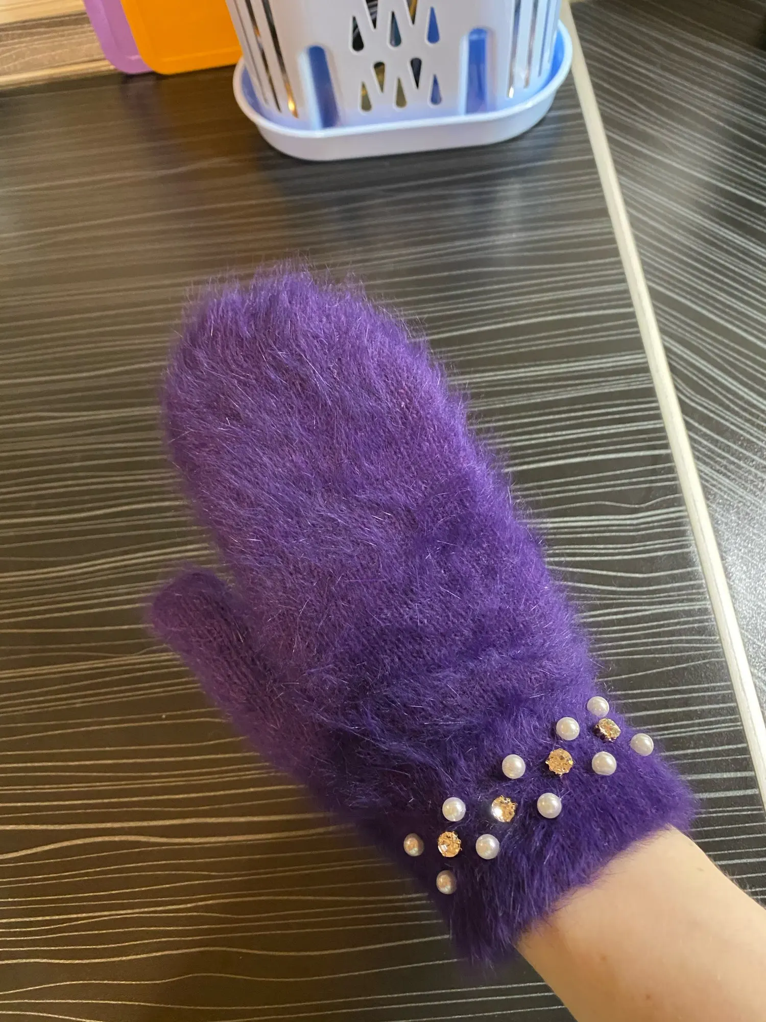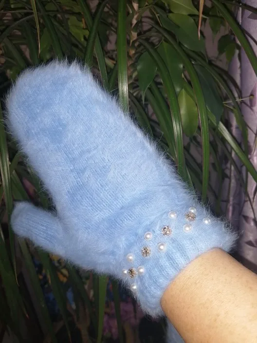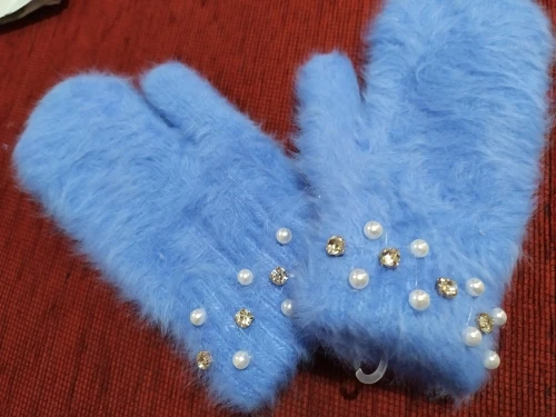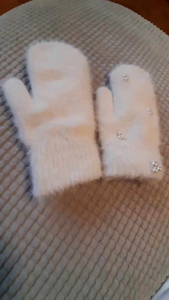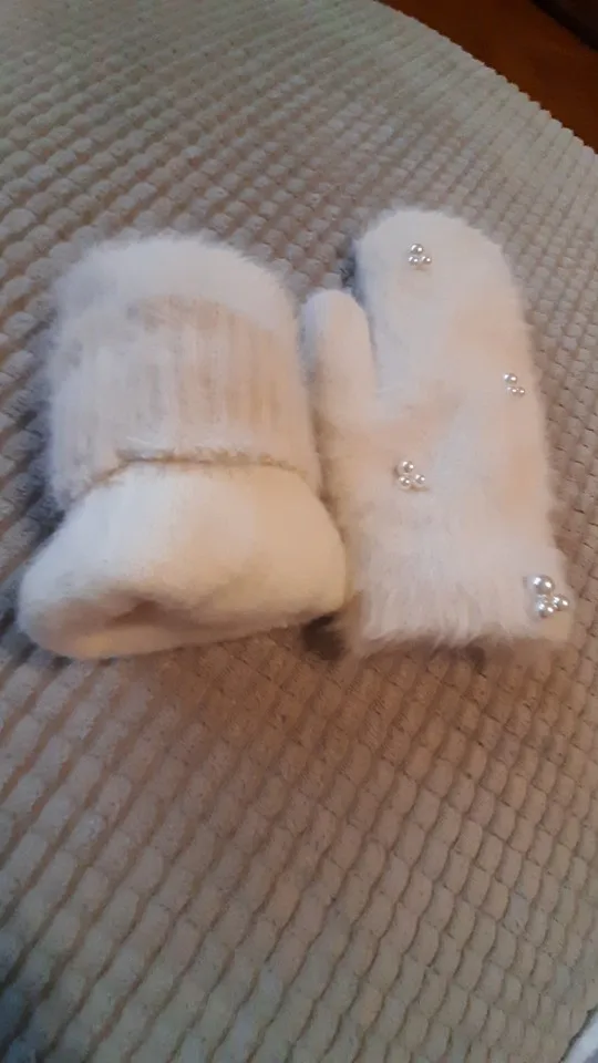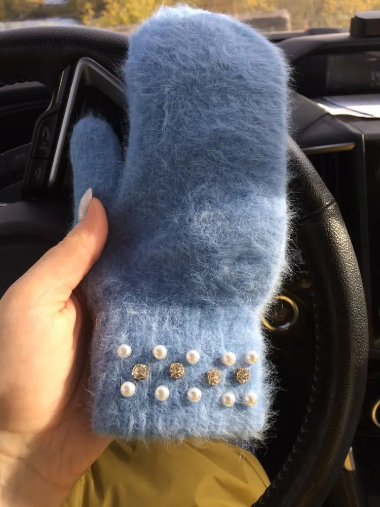 Варежки женские, зимние, из кроличьего меха, с жемчужинами