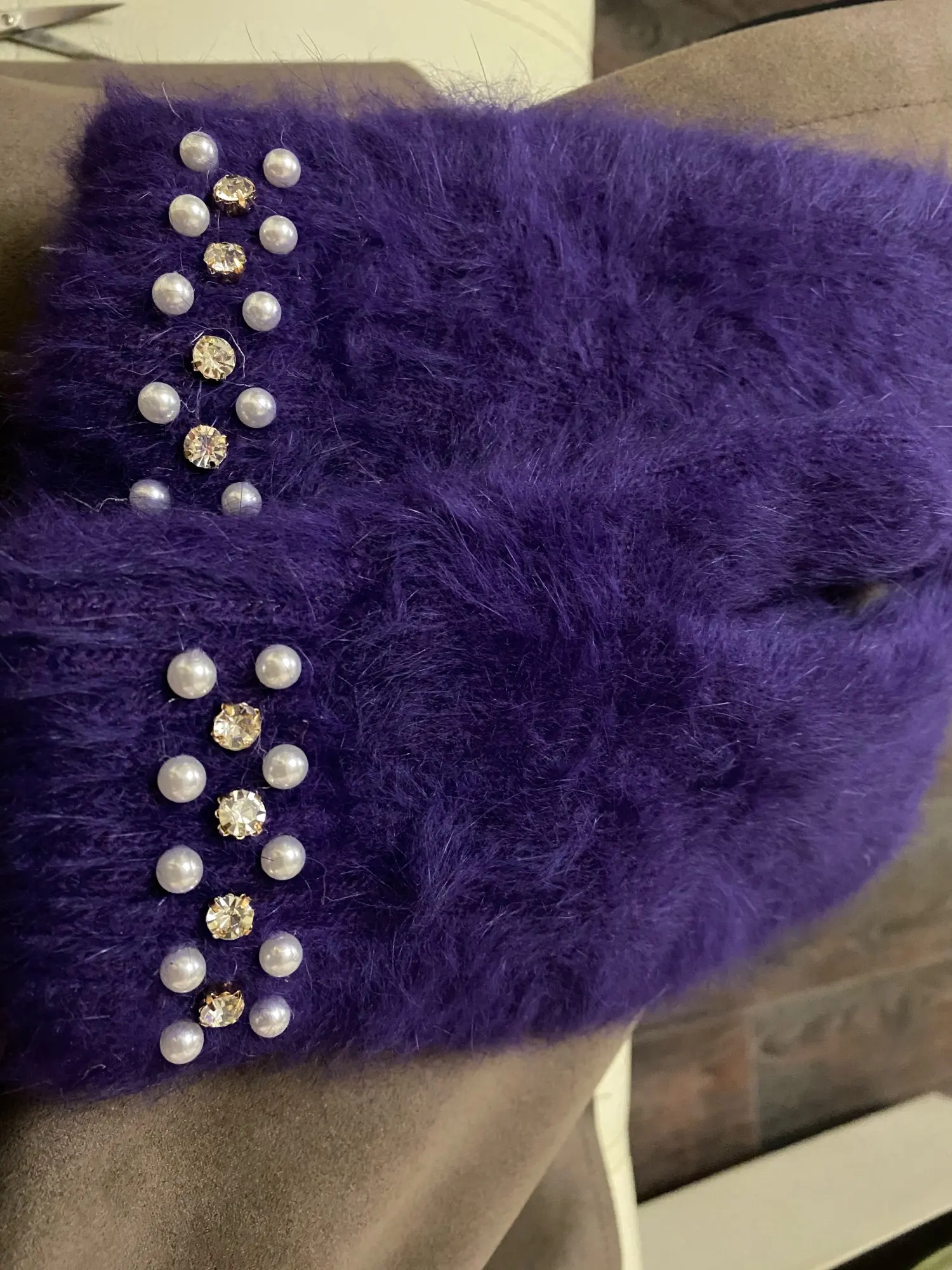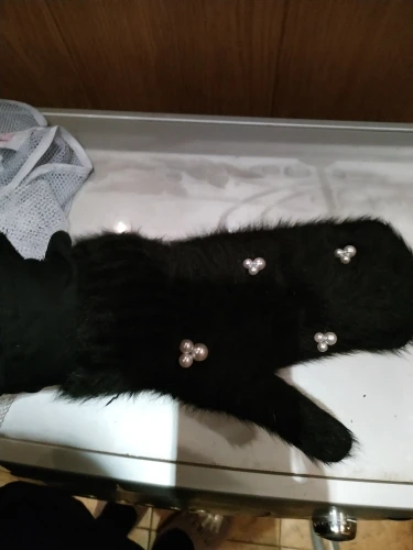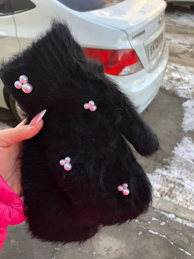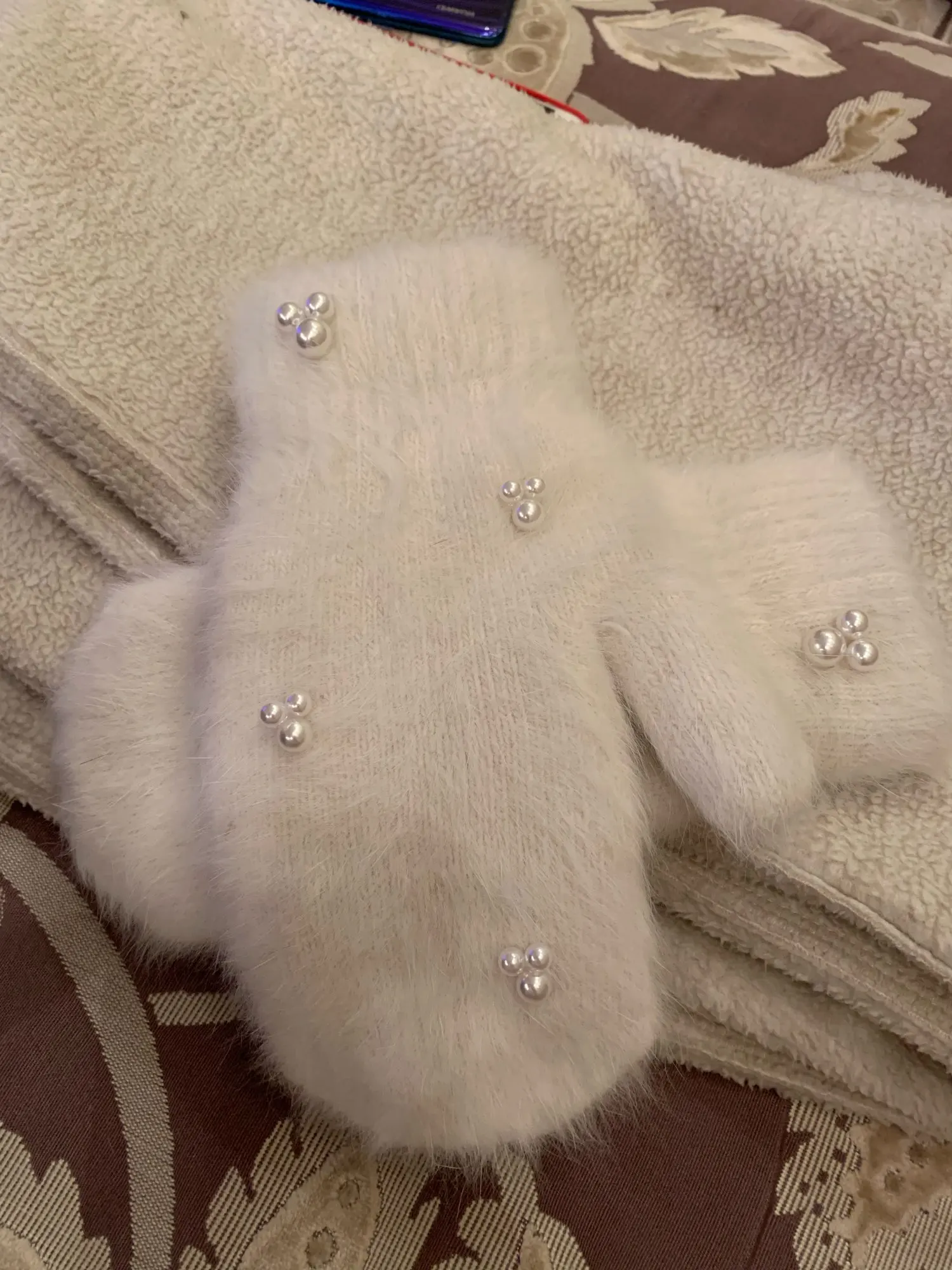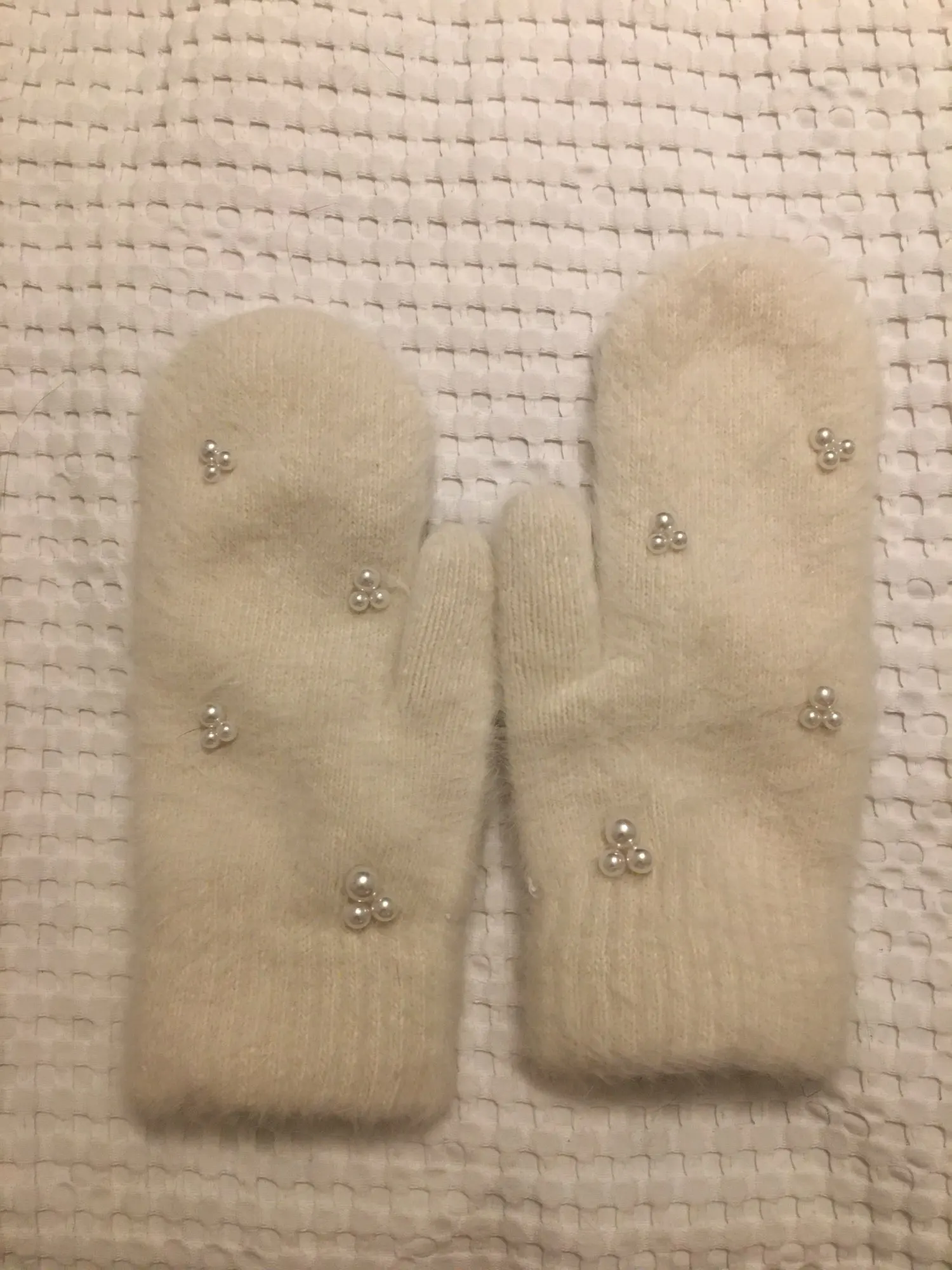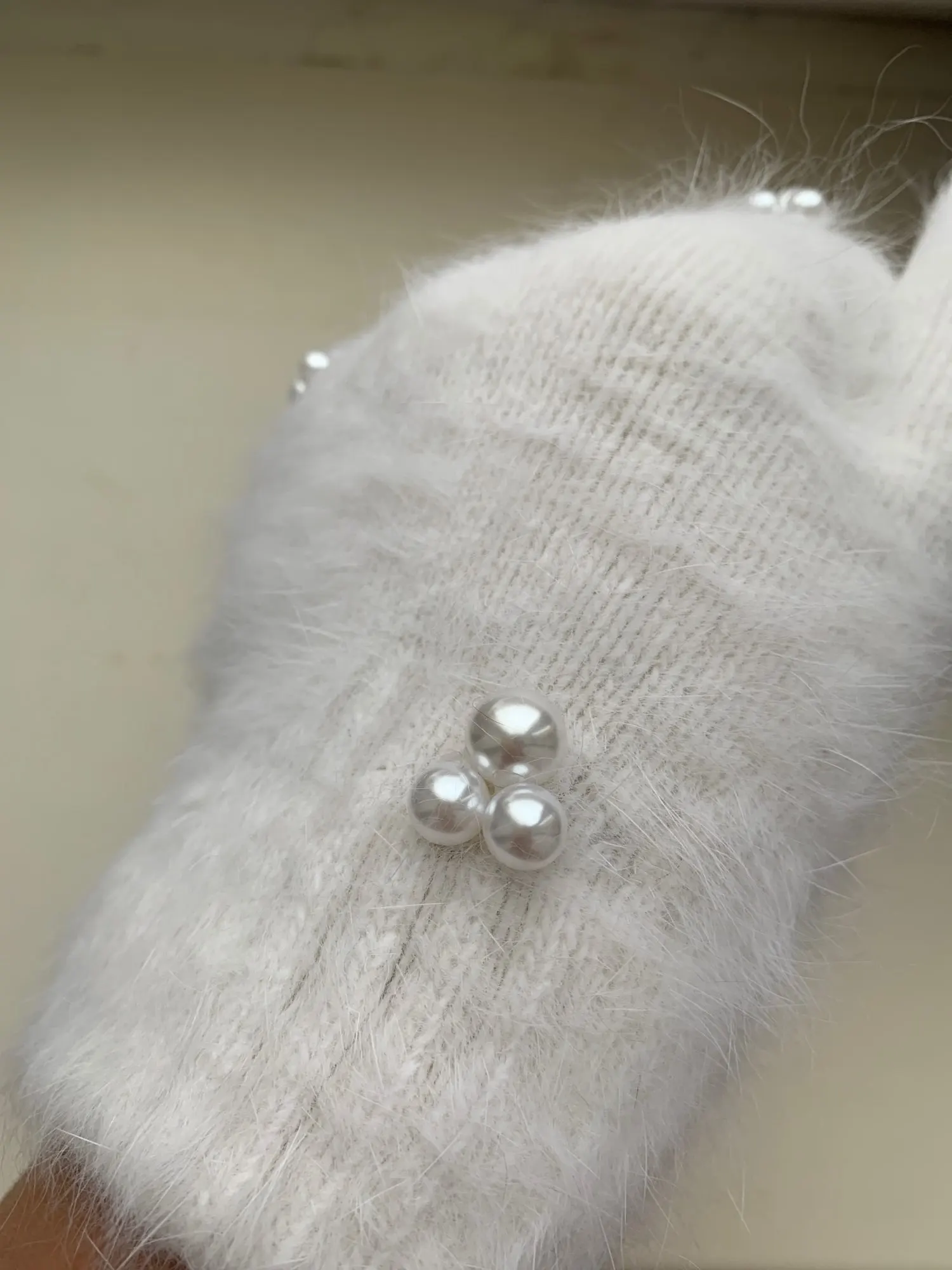 Варежки женские, зимние, из кроличьего меха, с жемчужинами