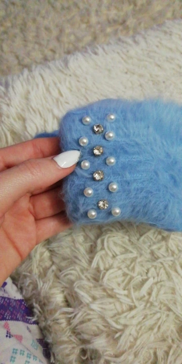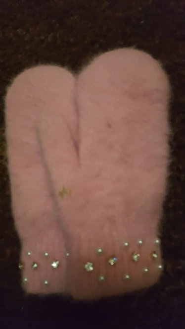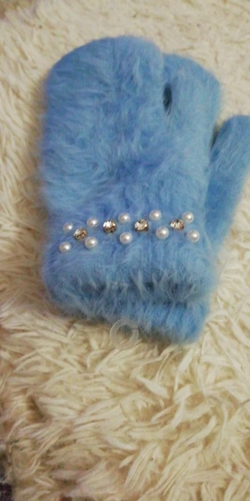 Варежки супер, цвет соответствует фото. Пушистые, справа немного летел пух, постепенно перестал. Стразы приклеены, а не пришиты.