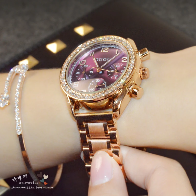 Модные брендовые роскошные женские Часы Guou с 3 отверстиями и шестью штырьками, многофункциональные золотые часы из нержавеющей стали, Женские кварцевые наручные часы