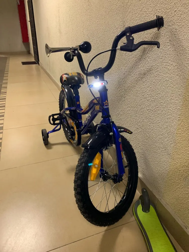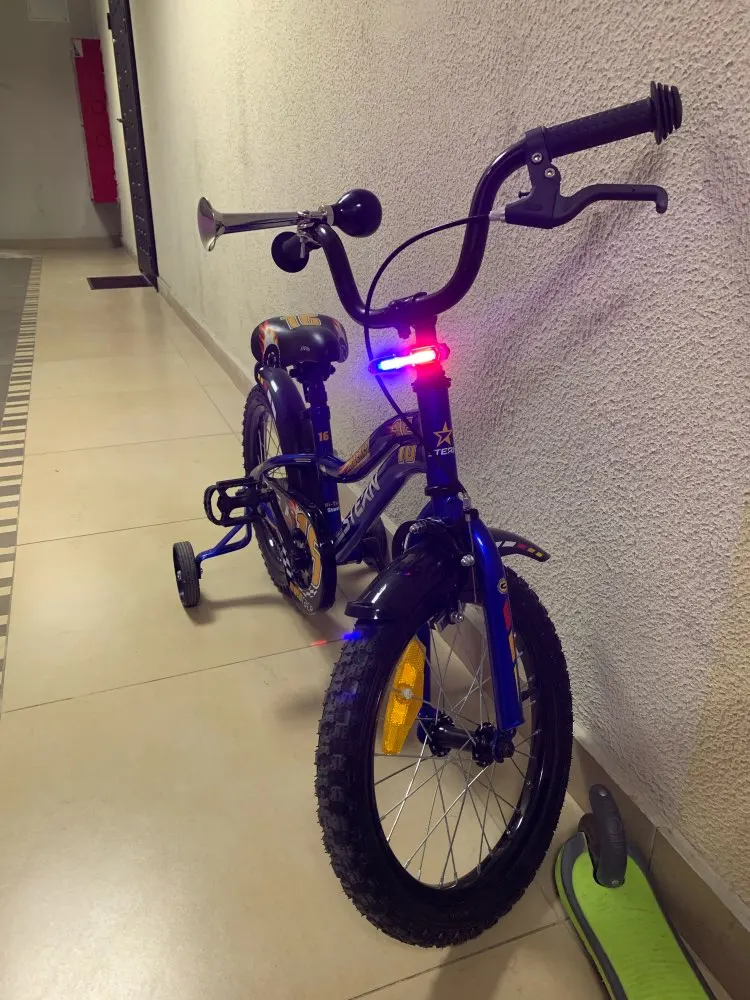 Отличный фонарь для детского велика с полицейским стробоскопом и белым светом. Ребёнок счастлив.