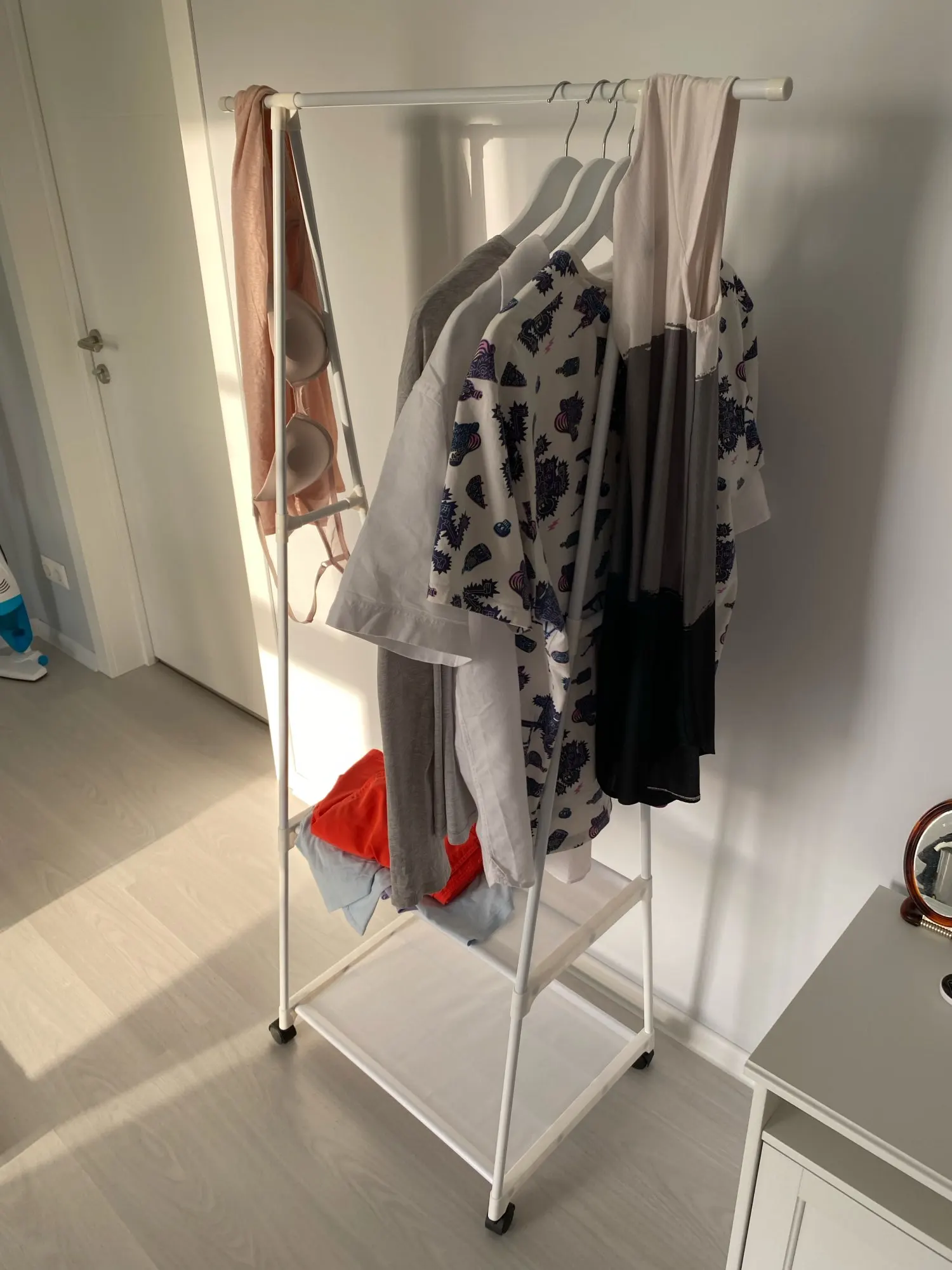 Пришла быстро. Каркас метал. Конструкция хлипкая . Но кинуть повседневные вещи можно . В целом симпатично смотрится. При уборке отодвигаю , она шатается, как будто сломается. Но можно и не двигать, швабра пролезает под неё.