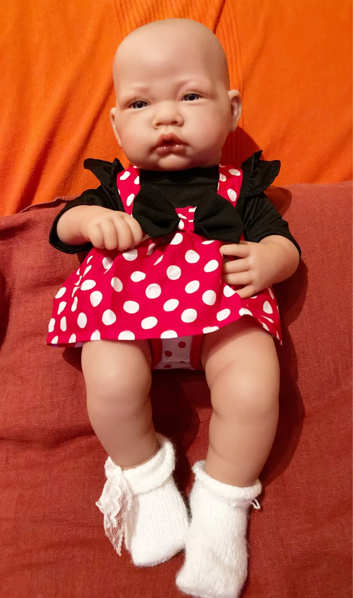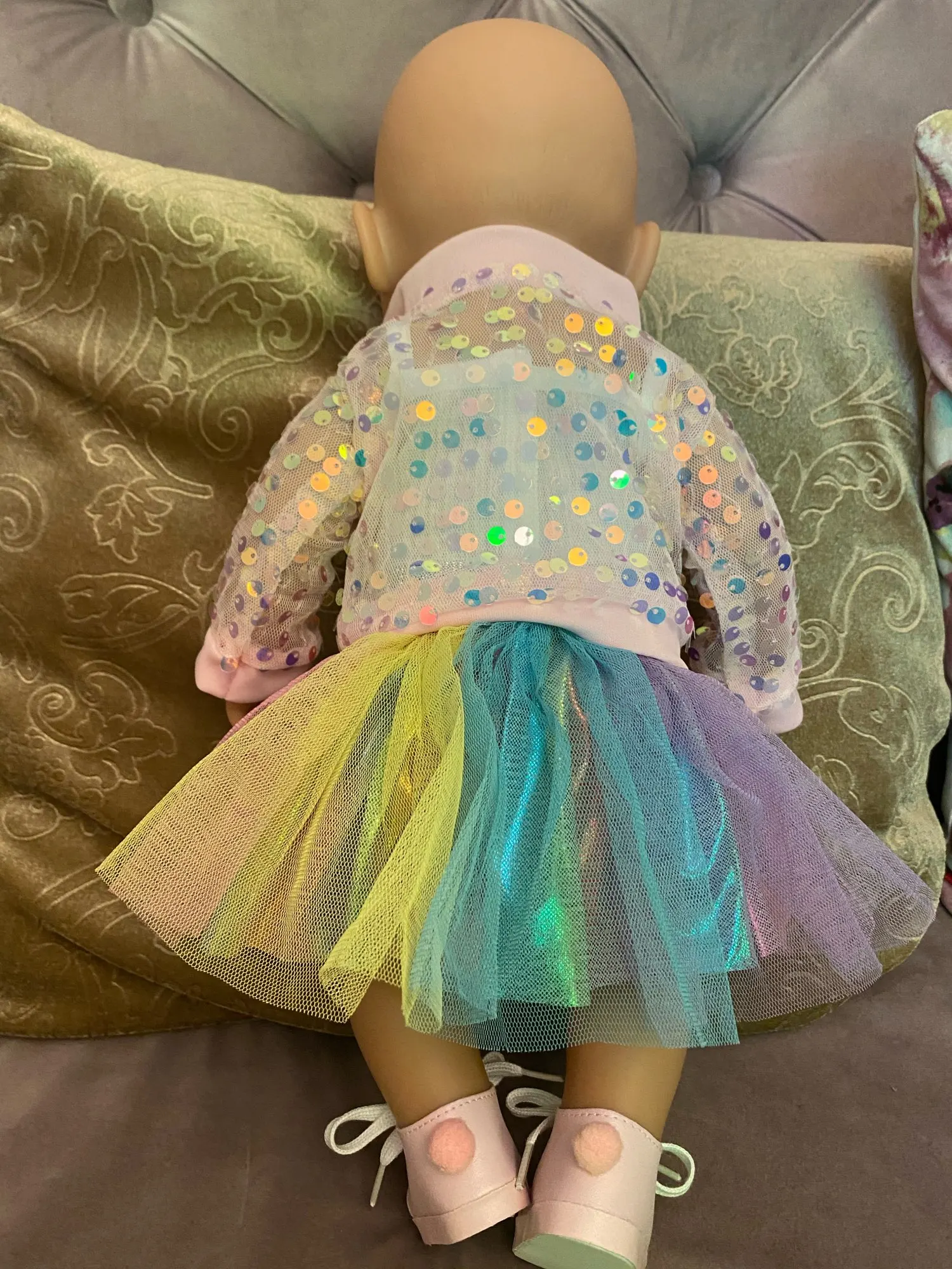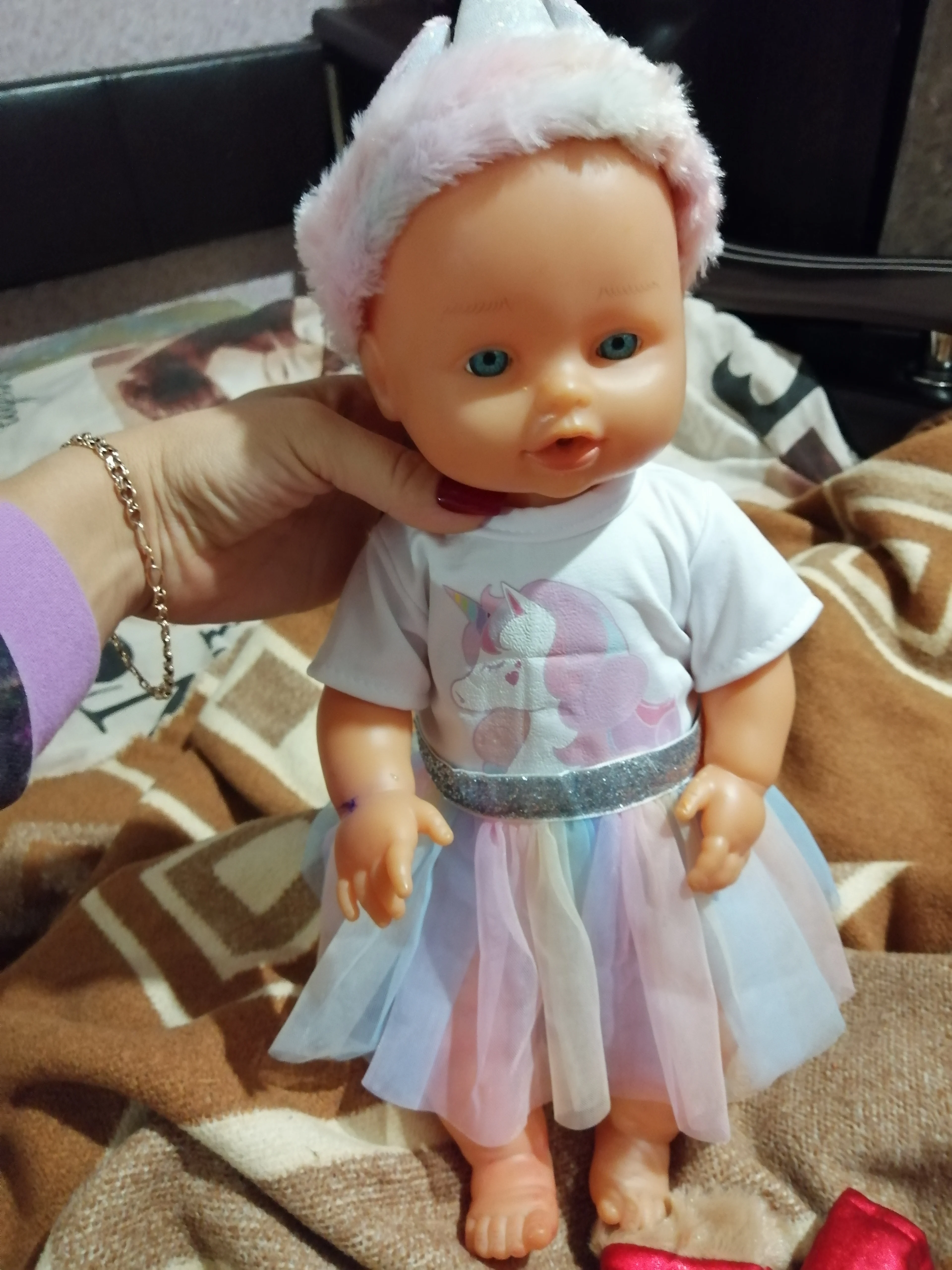 Наряд красивый. Бодик подошёл на реборн 42 см с силиконовым туловищем. Юбка не застегнулась.