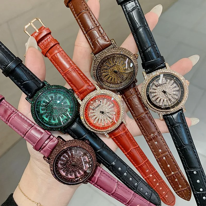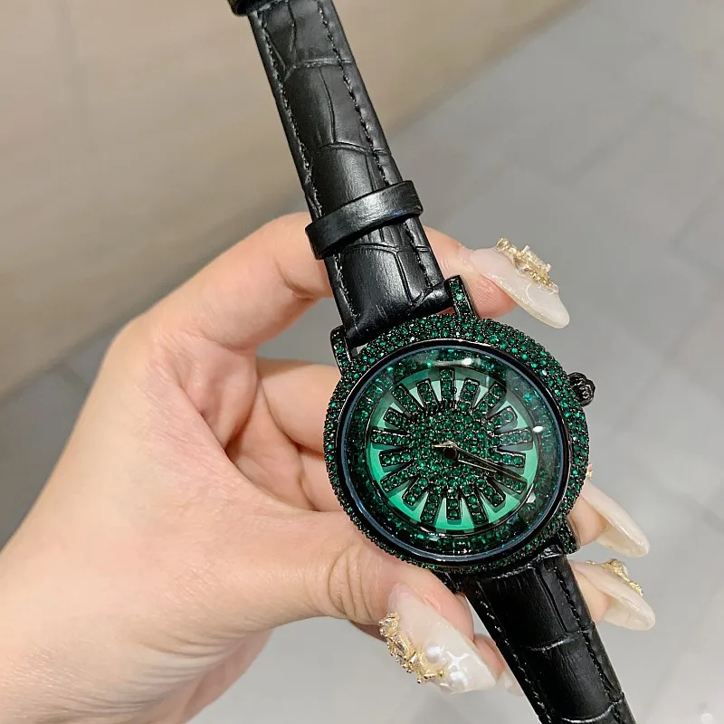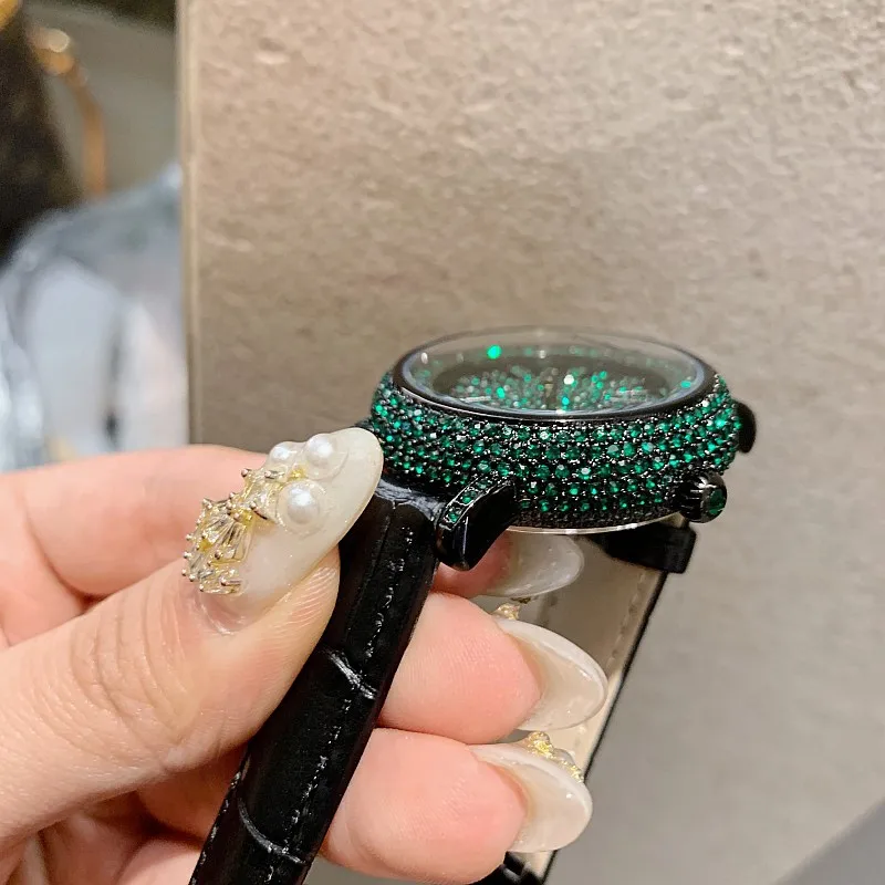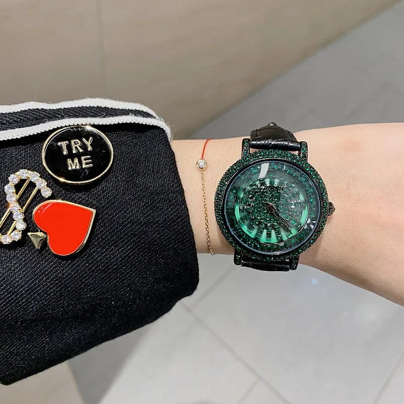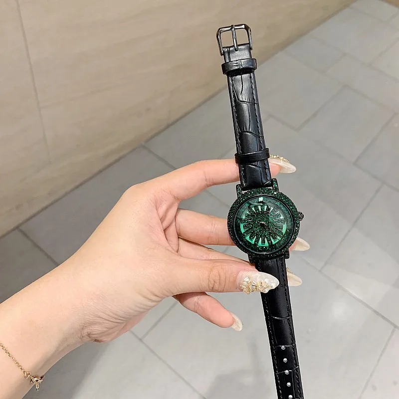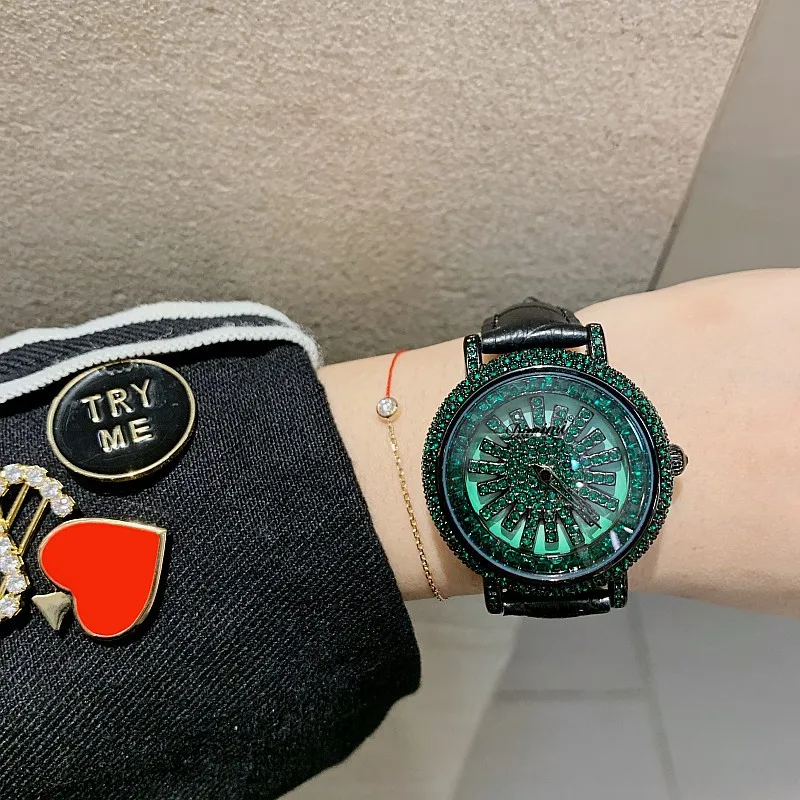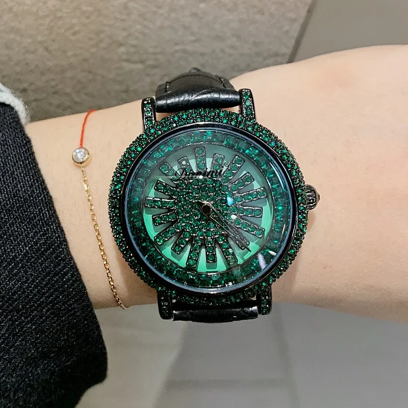 Лидер продаж 2020, женские часы из нержавеющей стали, женские Сияющие вращающиеся наручные часы с большим алмазным камнем, зеленые часы, часы