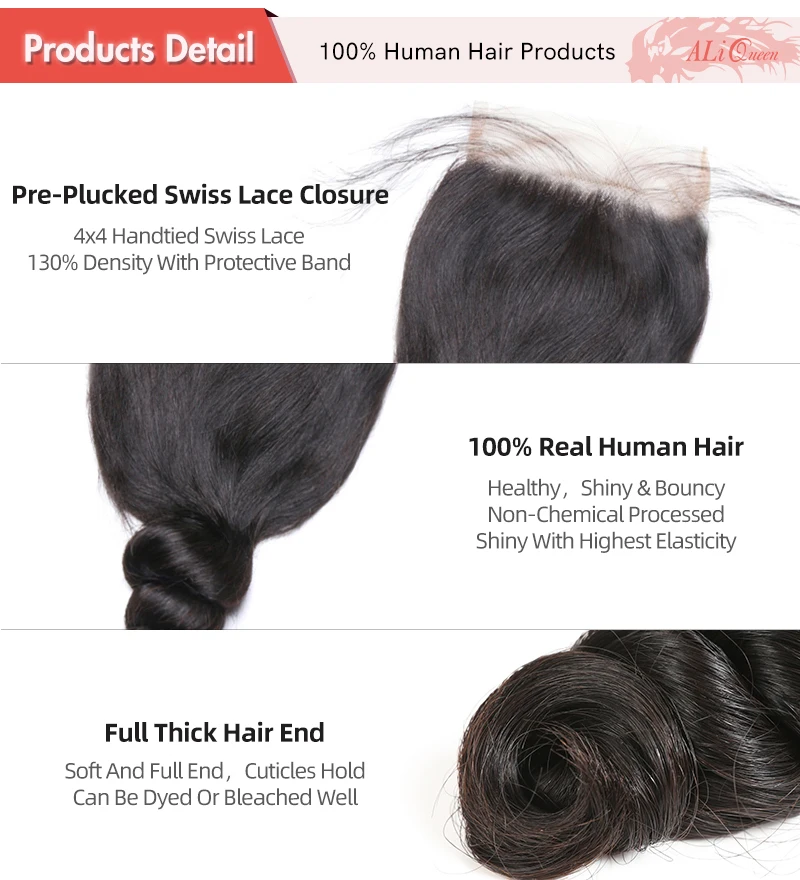 Наименование товара: бразильские Свободные Пряди человеческих волос с закрытием Бренд: Ali Queen Hair Products Co., Ltd Цвет волос: натуральный черный цвет, может быть окрашен и отбелен. Текстура застежки: швейцарское кружево Размер застежки: 4x4 с плотностью 130% Длина волос: 10 "~ 26" Материал волос: 100% человеческие волосы высокого качества Время доставки: около 2-5 дней по DHL/FEDEX Характеристика: здоровая, полная и упругая текстура