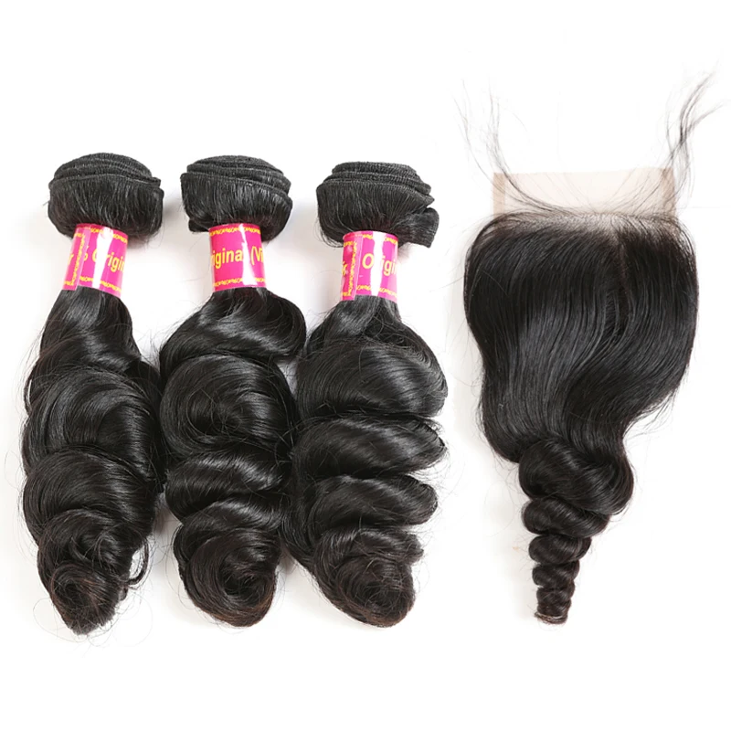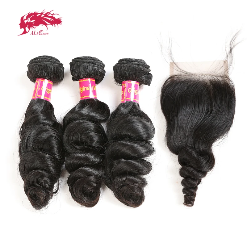 Пряди человеческих волос Ali Queen с 4X4 кружевной застежкой, бесплатная часть, предварительно выщипанные бразильские свободные волнистые натуральные пучки волос с застежкой