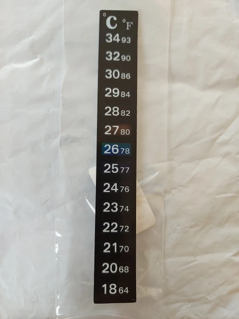 Термометр меняет цвет в соответствии с окружающей температурой. Если температура окружающей среды составляет 27 °C, то фон отметки 27 °C станет красочным, а другие отметки шкалы останутся черными.