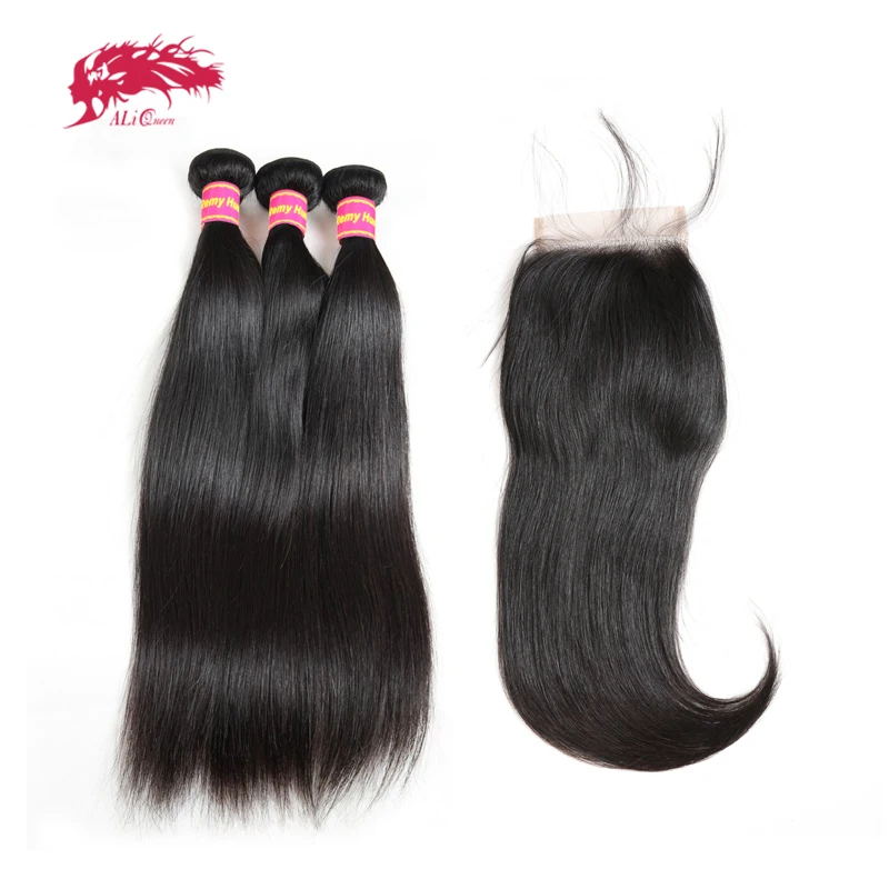 Ali Queen волосы 4x4 5x5 HD кружевная застежка с пряди 34 шт. бразильские Прямые Человеческие волосы Remy пряди с застежкой Бесплатная доставка