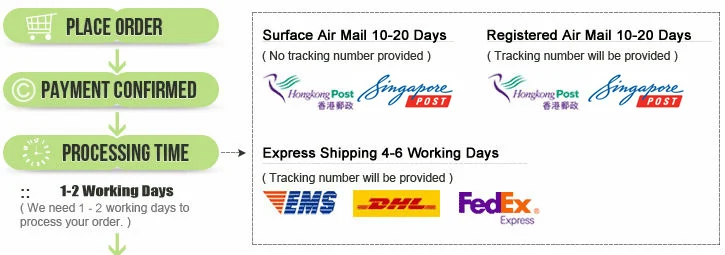 2. Время доставки:A) авиапочтой: обычно, около 7-21 рабочих дней. Бесплатная доставка авиапочтой Сингапура и Почта Гонконга.Б) Экспресс: как правило, около 4-6 рабочих дней, бесплатная доставка для оптовых заказов через UPS EMS и DHL. Скидка 50% на общий заказ.