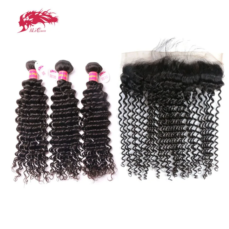 Волнистые бразильские натуральные человеческие волосы Ali Queen Hair, 34 шт., пряди с кружевной фронтальной, естественного цвета, искусственная кружевная фронтальная