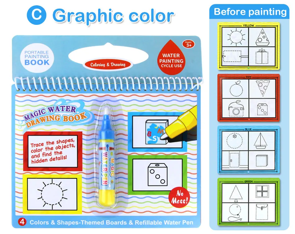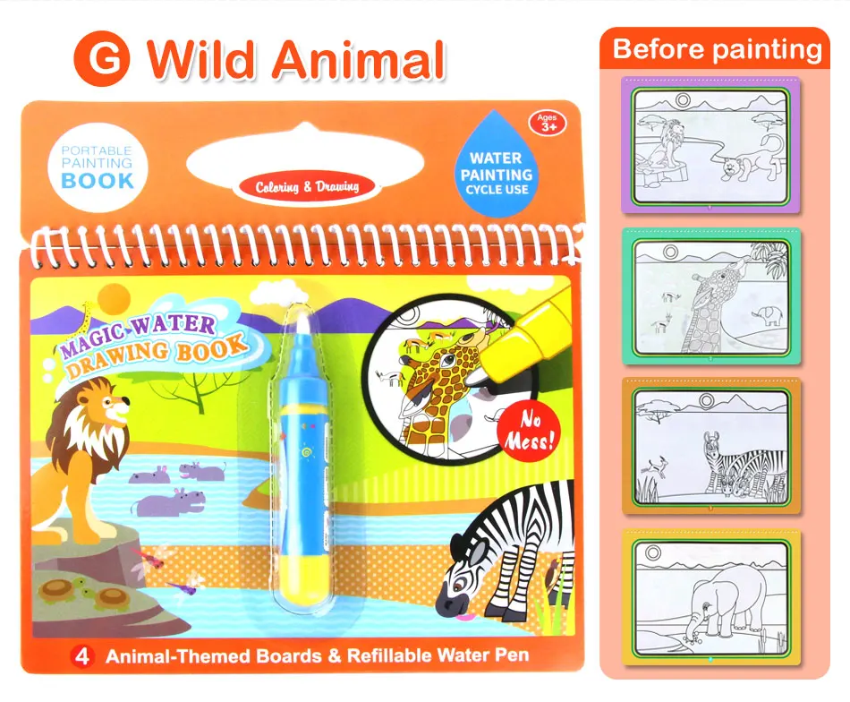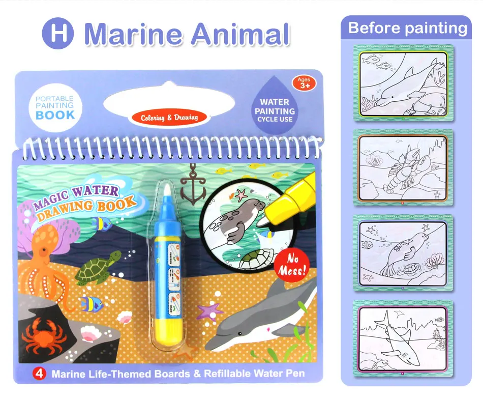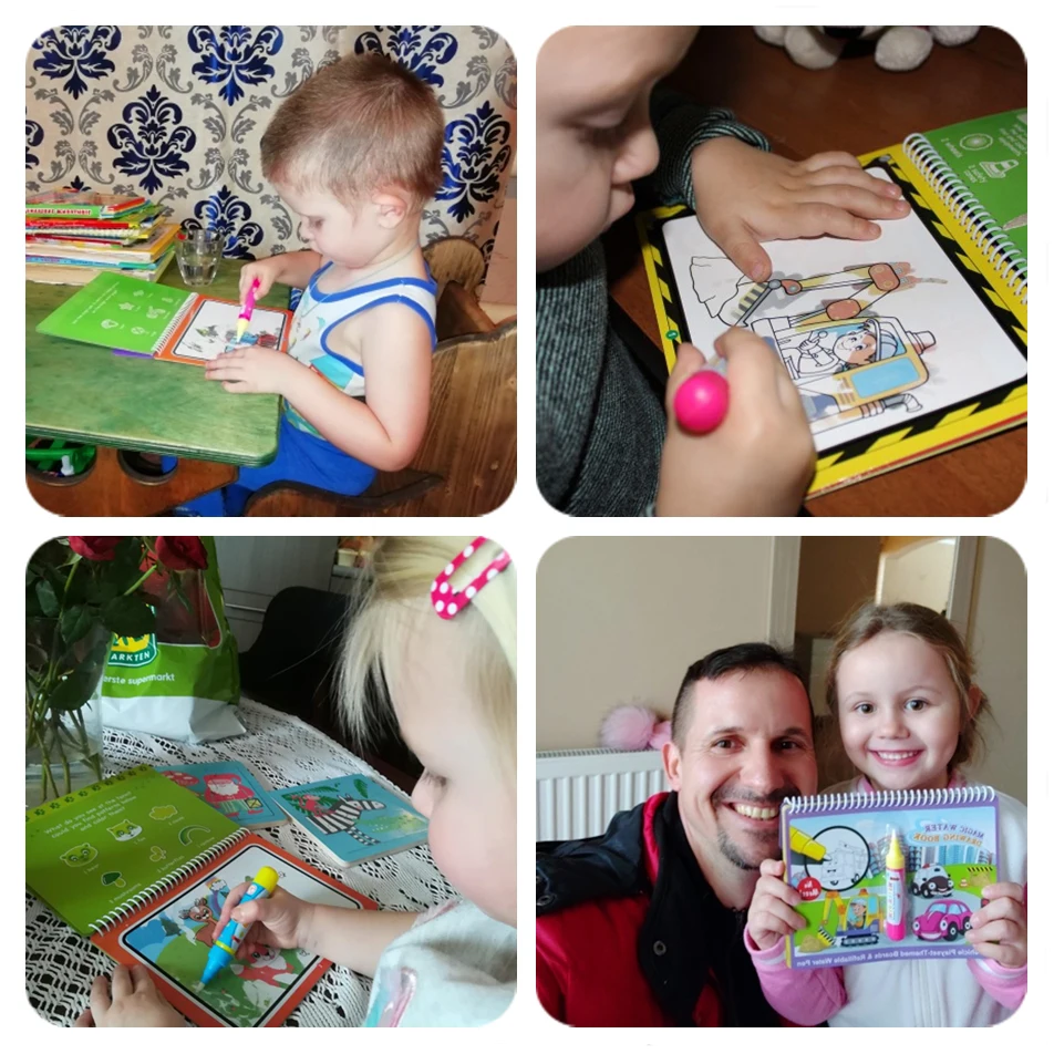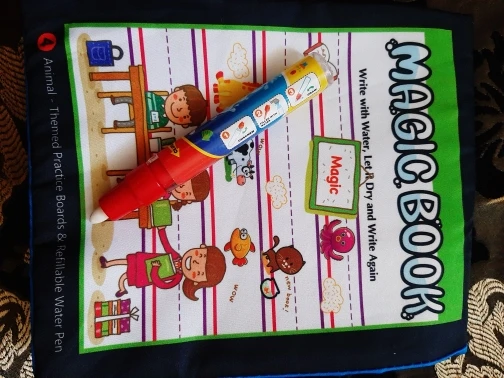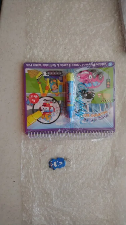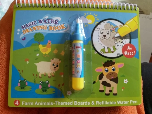 Отличная книжка. Ребенку в 2 года интересно. Только он слишком сильно нажимает на карандаш. А в мокром состоянии покрытие можно легче сцарапать. Стали пользоваться водяным пистолетом. Продавец в подарок положил страшненький брелок