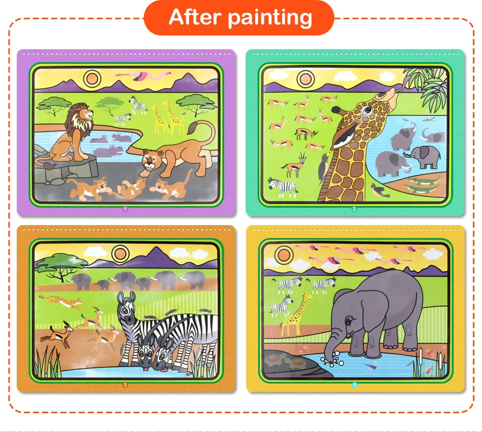 Ребенку понравилось. Раскрашивала минут 30. Потом стала грызть фломастер. ладно хоть там вода. 4 картинки с животными, которые быстро раскрашиваются. В фикс прайс подобные есть раскраски дешевле.
