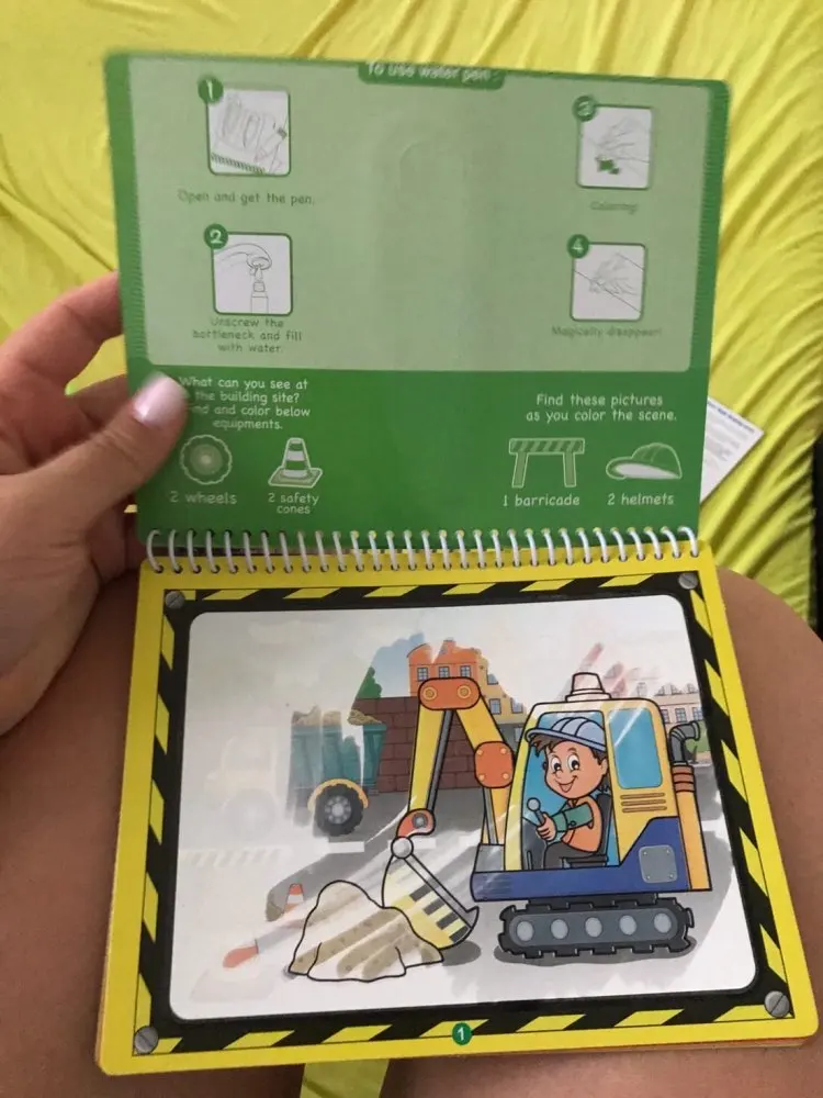 книжка супер.качество хорошее. понравилось еще,что есть надписи не больших деталей на картинке, что и так понятно(трактор и т.д.) а мелких,например, две каски, один блок и т.д. И с цифрами. листы не рвуться при намокании.