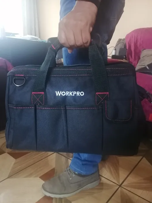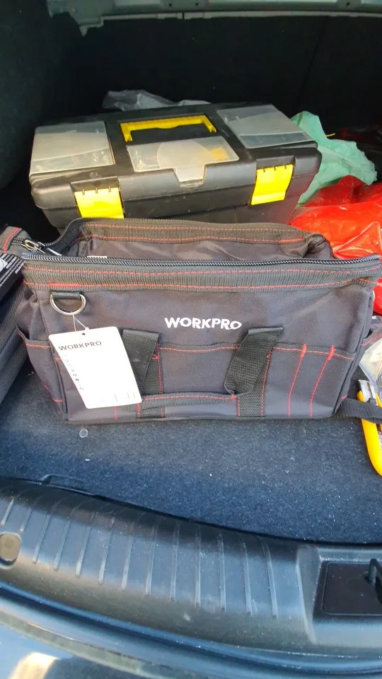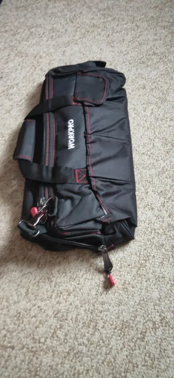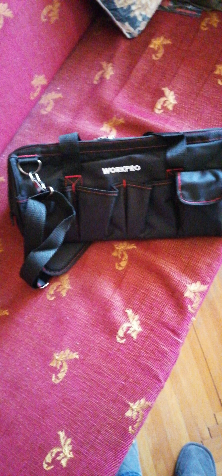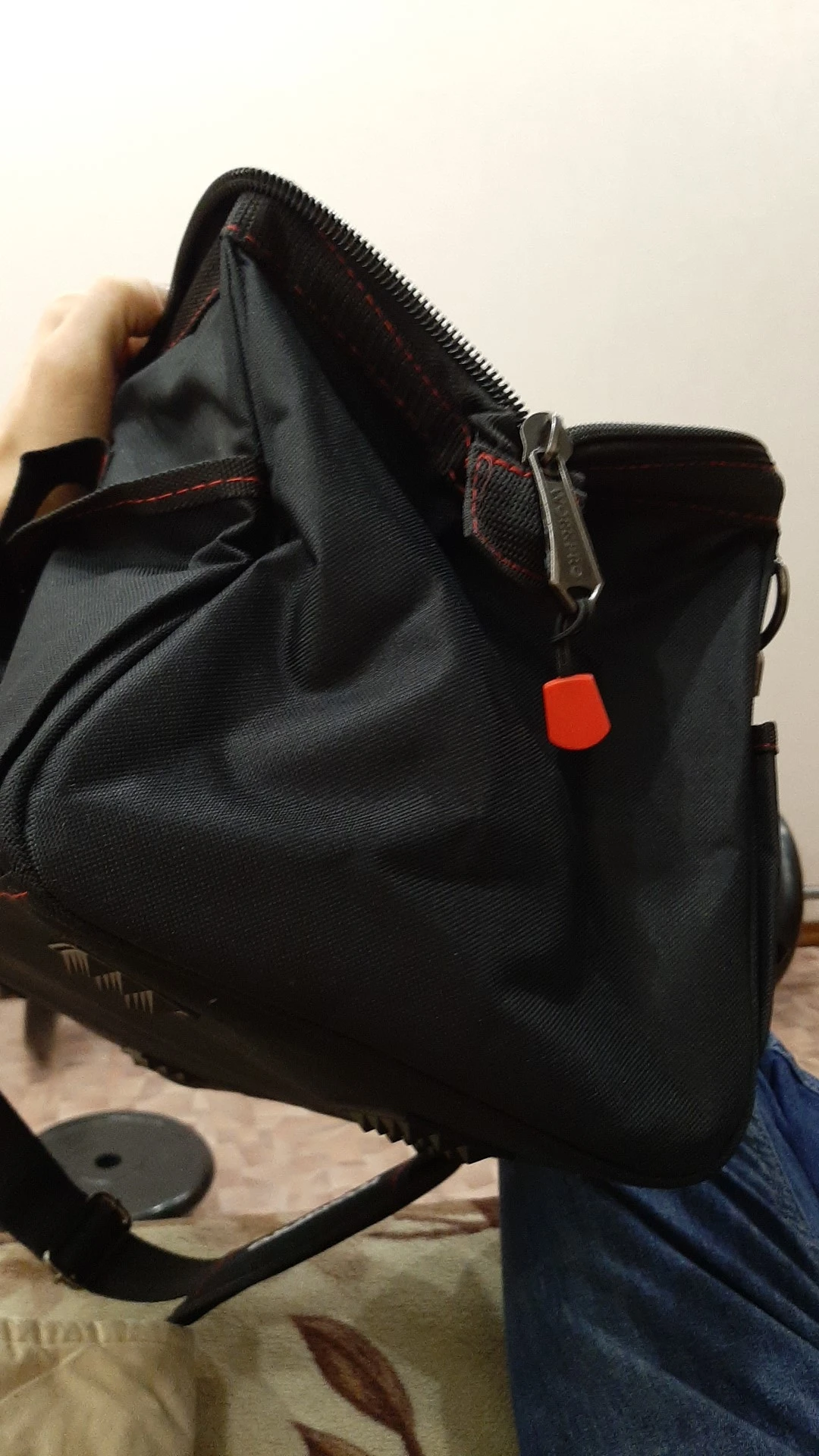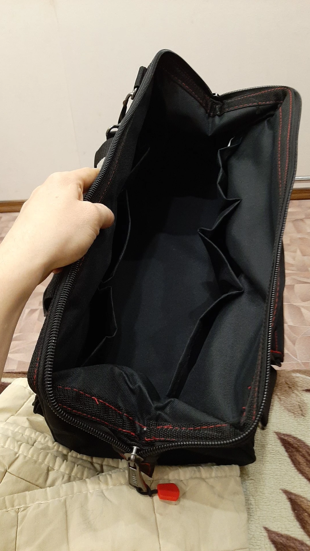 На последнем фото сумка с пластиковым дном. пришла с матерчатым. Сумка низковатая. отвёртки стоя длинные точно не влезут. Для ручного инструмента типа пассатижи и т.д норм, можно уровень и пару шаблонов закинуть. Мультик нормального размера тоже придется в кучу кидать.